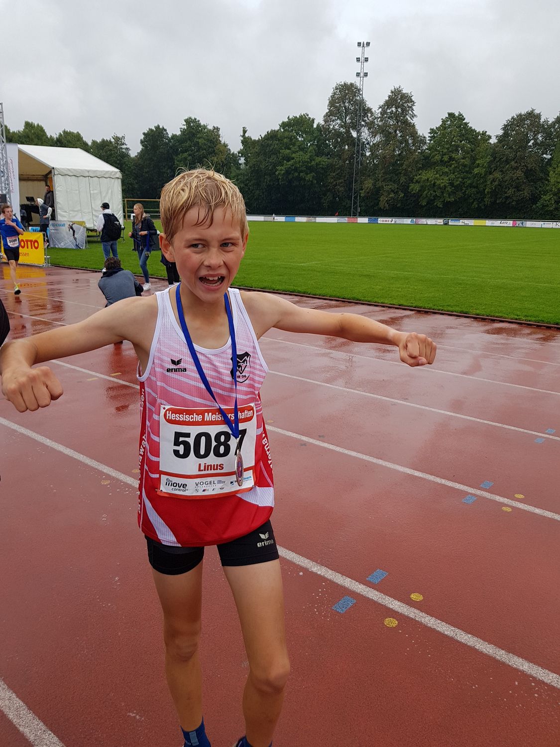 Über fünf Kilometer mit Start und Ziel am Weiherhausstadion lief Klinge in 18:36 Minuten einen klaren Vorsprung gegen Maximilian Evert (TV Petersberg; 19:14) in der M13 heraus und holte mit persönlicher Bestzeit zum zweiten Mal in diesem Jahr den begehrten Meisterwimpel. Im Gesamtlauf aller Nachwuchsklassen waren nur zwei Jungen der M15 schneller. „Bei mehr Konkurrenz wäre trotz der schlechten Bedingungen mit Dauerregen eine schnellere Zeit möglich gewesen. Die beiden älteren Schüler konnten sich nach 1,5 Kilometer absetzen und Nico Debus (SSC Hanau-Rodenbach) und Jan Langenkamp (LT Kassel) fehlten“, erklärte Vater Stefan Klinge. Somit verbleibt der Kreis- und Nordhessenrekord von 17:37 Minuten weiterhin bei Hendrik Franke (LG Reinhardswald/SV Espenau), der diese Zeit im Oktober 2007 in Schoningen erzielte.