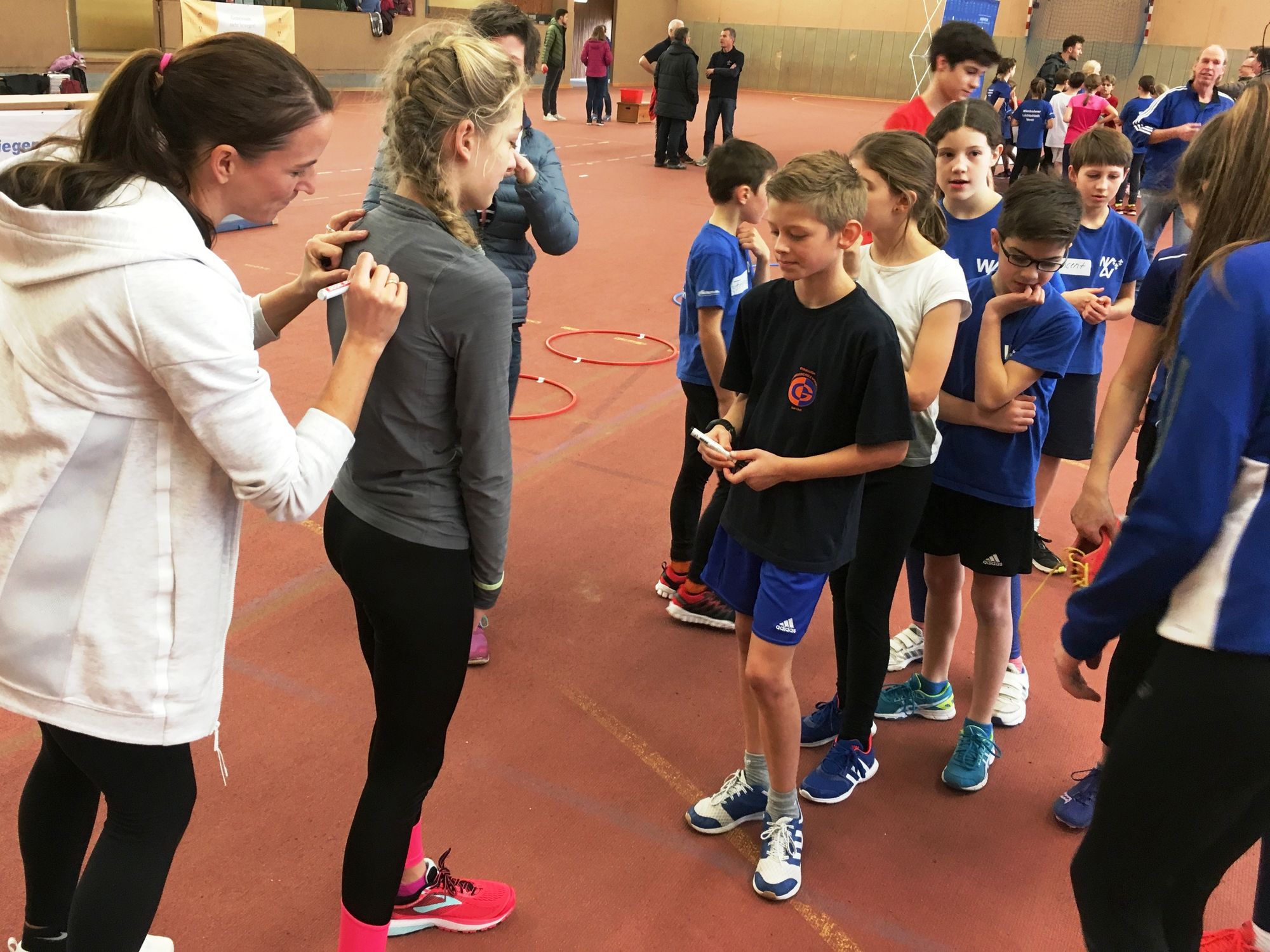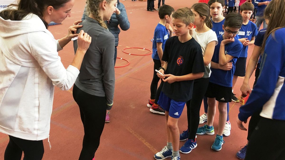 Ansonsten drehte sich am Samstag in Hessen so gut wie alles um den Ball des Sports in Wiesbaden. Im RheinMain CongressCenter war auch die WM-Zweite Carolin Schäfer (Siebenkampf) zu Gast - in der großen Show-Promotion für die EM in Berlin wirkten zwei weitere hessische Topathleten mit: Vanessa Grimm demonstrierte den Hürdenlauf, Gianluca Puglisi den Weitsprung. Mehrkämpferin Claudia Salman-Rath war gemeinsam mit U20-Zehnkampf-Weltrekordhalter Niklas Kaul (USC Mainz) bereits mittags in die Sporthalle Wettinerstraße gekommen und bot ein Schnuppertraining für Kinder an. Die Veranstaltung war gut besucht, auch auf der Zuschauertribüne. Die Organisation und Betreuung der drei Stationen (Ballwurf, Hürdenlauf, Stabhochsprung) hatten Gudrun Rouhi, Sibylle Zigric und Diedrich Meyn übernommen. Der jüngere Leichtathletik-Nachwuchs ließ es auch bei der abschließenden Autogrammstunde richtig krachen - mal sehen, wie lange die Unterschriften auf den T-Shirts und den Seitenflächen der Turnschuhsohlen halten …
