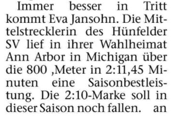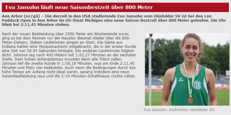 Diese Wochenende ging es für Eva mal nicht in die Ferne. Ein Wettkampf daheim stand auf dem Plan. Nach der neuen Bestleistung über 1.500m vom vergangenen Wochenende ging es dieses Mal wieder über die 800m-Distanz. Das Ergebnis kann sich sehen lassen; dieses Mal eine neue Saisonbestleistung, die Uhr blieb bei 2:11,45 Minuten stehen.