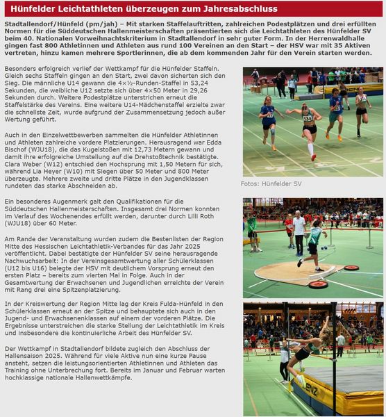Am 22. November hat der Hessische Talent-Mehrsprungcup in der Leichtathletikhalle in Frankfurt-Kalbach stattgefunden. Vom Hünfelder SV war Lotta Roth in der Altersklasse W13 am Start. Und Lotta stand damals mit der gesprungenen Weite von beachtlichen 15,90 Meter ganz oben auf dem Treppchen. Der Lohn war die Einladung zum 11. Deutschen Talent-Mehrsprung-Cup nach Leverkusen.