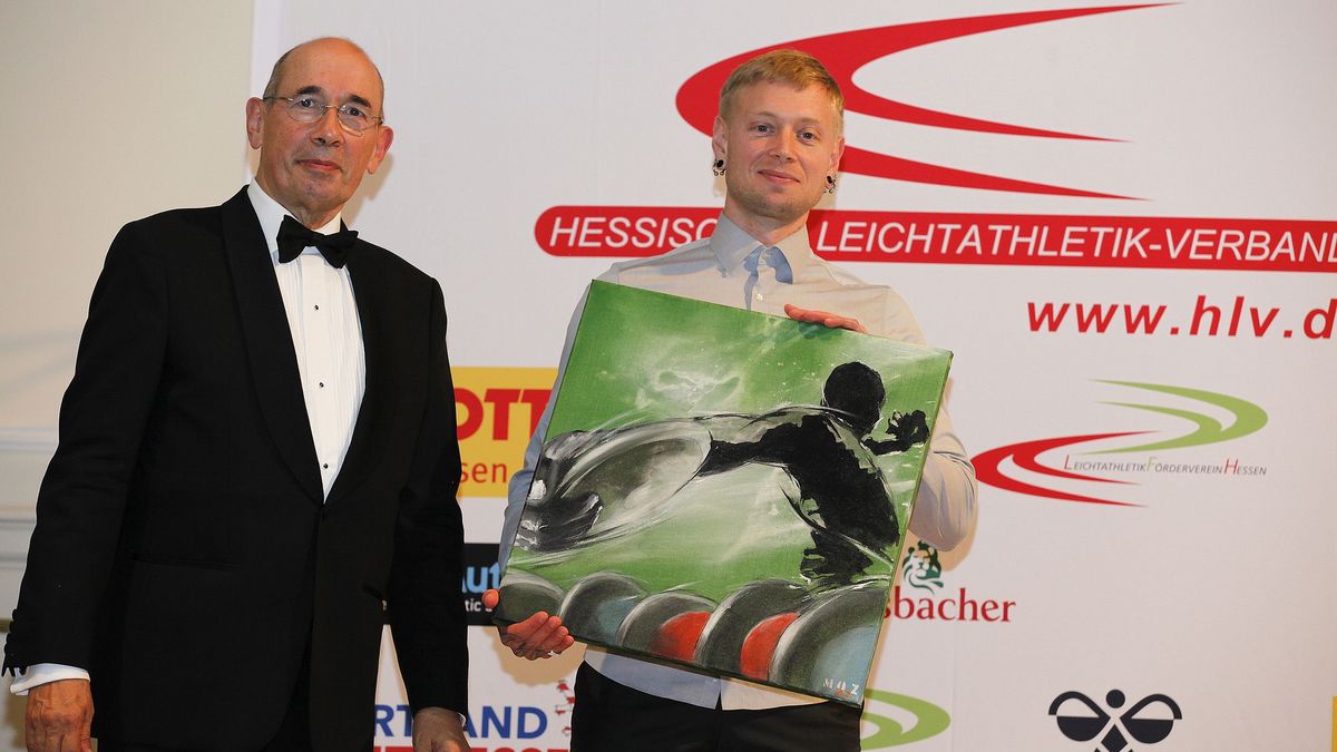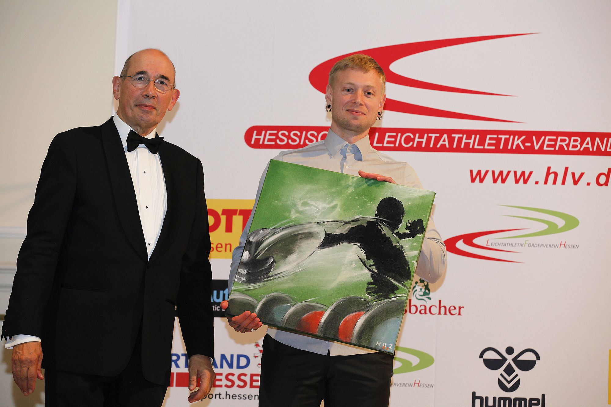 Neben den erfolgreichsten Sportlern wurden auch die erfolgreichsten Trainer in den Kategorien „Lebenswek“, „Nachwuchs“ und „Trainer des Jahres“ geehrt. Neben dem leider verhinderten Klaus Powilleit (Lebenswerk) durften sich Bastian Otto (Nachwuchs), kürzlich auch zum DLV-Nachwuchstrainer des Jahres gekürt, und David Corell (Trainer des Jahres) über die Auszeichnungen und ein personalisiertes Gemälde von Udo Kneffel freuen.
