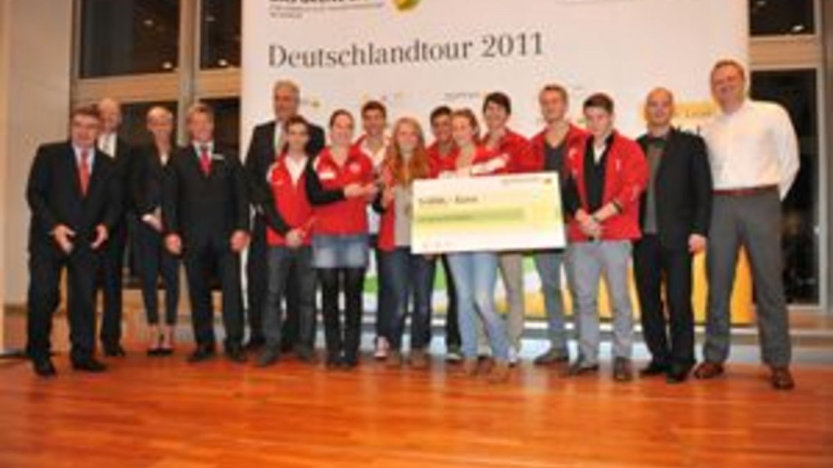 Rund 1.550 Prämierungen, zirka 200.000 geförderte Jugendliche und 7,8 Millionen Euro: Das ist die Bilanz aus 25 Jahren „Grünes Band für vorbildliche Talentförderung im Verein“. Zum Jubiläum gratulierten im 49. Stock des Commerzbank-Hochhauses in Frankfurt unter anderen DOSB-Präsident Thomas Bach, Martin Blessing, Vorstandsvorsitzender der Commerzbank, sowie die Botschafterinnen des mit 5.000 Euro dotierten Preises, Hochsprung-Rekordhalterin Ariane Friedrich und Birgit Prinz. Glückwünsche gab es für die Gewinner des Abends, die LG Eintracht Frankfurt sowie den Radsportclub Langenselbold, den Frankfurter Golf Club, die Rugby-Abteilung des Sportclubs Neuenheim und die Sportkegler Münstermaifeld. „Das Grüne Band strahlt nach 25 Jahren genauso intensiv wie am Anfang. Das Konzept hat sich sehr bewährt. Es stärkt die Basis des deutschen Sports - unsere Jugend. Noch immer haben kleine Vereine genauso die Chance zu gewinnen wie die großen, nicht-olympische genauso wie olympische“, sagte Bach.<ENDE/>