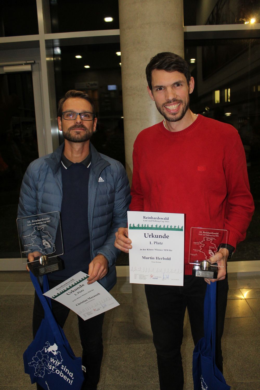 Gleich zwei Gesamtsieger im Männerfeld zeichnete Pietsch für den dienstlich verhinderten Landrat Andreas Siebert im Foyer des Kreishauses in Kassel aus. Christian Mazassek (LT Hofgeismar) und Michael Fiess (TSV Vaake) kamen nach drei von fünf gewerteten Rennen auf die gleiche Punktzahl und verhinderten den möglichen vierten Cup-Sieg von Martin Herbold (Tuspo Borken), der dann Rekordsieger geworden wäre. Dabei gab es ein Kuriosum: Während Mazassek im Gesamteinlauf bei den Läufen besser abschnitt als Herbold, musste sich der Hofgeismarer in der Altersklasse M30 mit einem Punkt Rückstand geschlagen geben. Bei zwei direkten Duellen in Hofgeismar und Niedermeiser lag Mazassek immer vor Fiess.