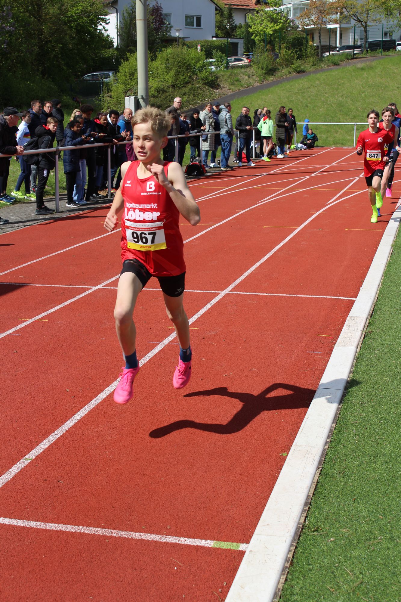 Bis kurz vor die 2000 Meter-Marke lief eine achtköpfige Gruppe mit Athleten der M14 und M15 zusammen. Hier galt es sich auf den fünf Runden sich im Feld zu verstecken und Kräfte zu sparen. Dann sprengte Klinge mit einer deutlichen Temposteigerung das Feld und viele Lücken taten sich auf. Als stärkster Konkurrent entpuppte sich wie im Vorfeld erwartet Jono Kempin (ASC Darmstadt), der den Abstand in der vorletzten Runde etwas verkürzen konnte, doch in Schlagdistanz kam der Südhesse nicht mehr. Dagegen zündete Klinge nach der Glocke für die letzte Runde die nächste Geschwindigkeitsstufe und lief dann einen ungefährdeten Sieg mit einem letzten Kilometer in bemerkenswerten 2:57 Minuten nach Hause. Kempin benötigte 9:58,24 Minuten und Leo Klessiek (LAV Kassel) 10:07,61 Minuten als Dritter. „Die besprochene Taktik ist voll aufgegangen, denn dadurch wurde der vermeintlich bessere Spurter Kempin abgehängt“, freute sich Trainer Mustafa Hallal.