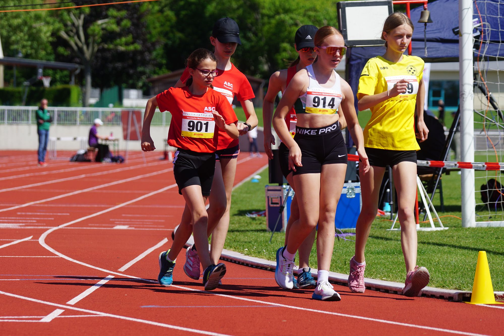 Bahngehen steht ja bei uns im Verein, im Kreis und auch in Hessen nicht gerade als feste Größe auf der Agenda! Und global für Hessen möchte der Hessische Leichtathletik-Verband das ändern! Deshalb ist im Bereich der Kinderleichtathletik (KiLa) für das diesjährige Hessenfinale, man muss schon sagen etwas Hals über Kopf, die 3x600m-Gehstaffel als Disziplin gesetzt worden. Das hat wenige glücklich gemacht, Gehen steht bei der überwiegenden Zahl der Vereine hessenweit halt nicht auf der Agenda. Aber es ist wie es ist, und man muss aus der Situation das Beste machen. Bedeutet, dass unsere U12er Athleten sich das Gehen im Training aneignen müssen. Lotta, der KiLa gerade entwachsen, hat es dann auch mal probiert. Das sah gut aus, und Lotta meinte, dass sie da gerne auch mal einen Wettkampf mitmachen würde. Ja, und das war dann heute, dass erste wettkampfmäßige Gehen gleich bei den Hessischen.