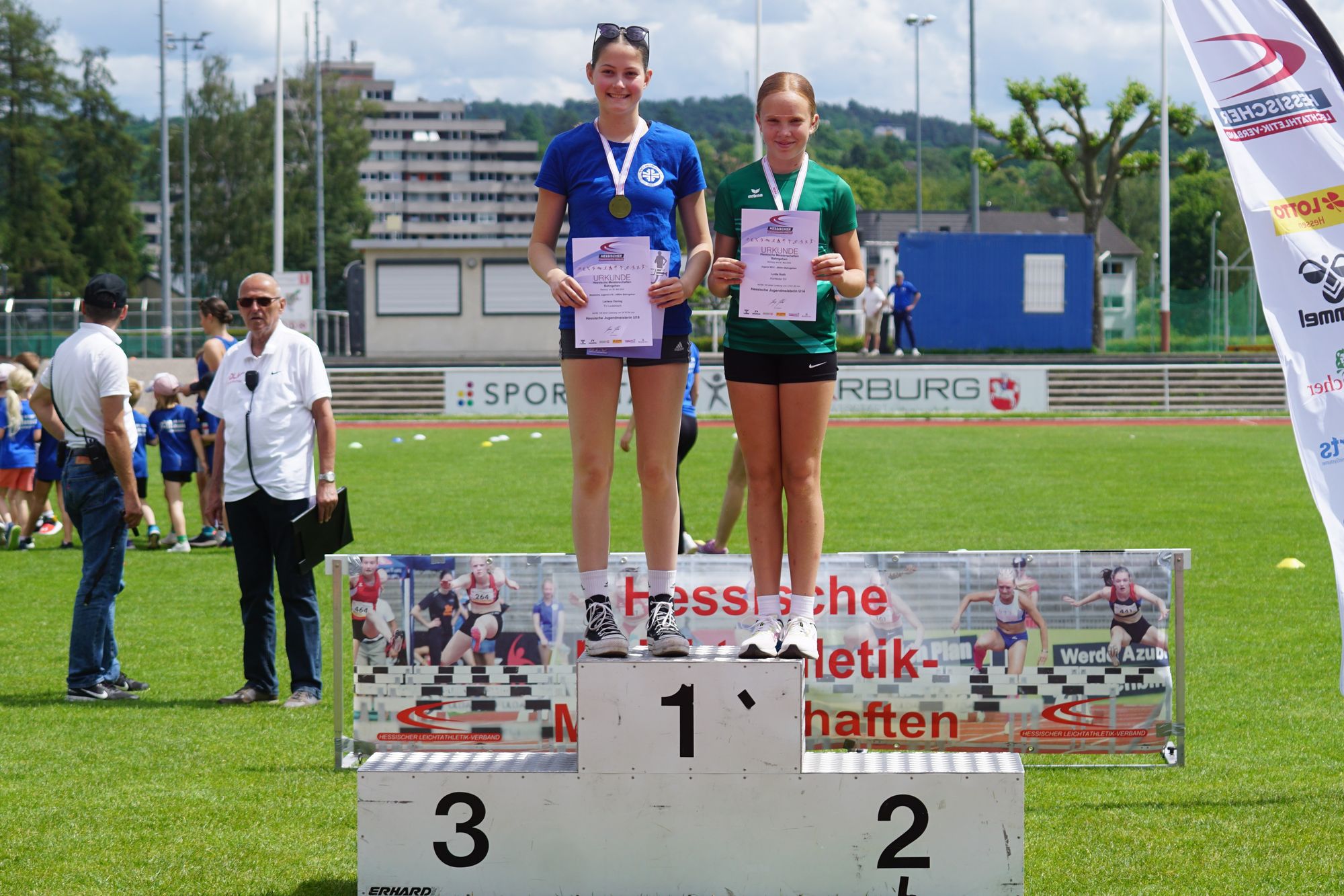 Zum Foto der Siegerehrung noch ein paar Worte. Da stehen die Hessenmeisterinnen der WJU18 und der W12 auf dem Podest. Diese beiden Altersklassen hatte man bei der Siegerehrung glatt vergessen. Eineinhalb Stunden nach dem Rennen, die Offiziellen waren schon nicht mehr da, haben dann, nach Intervention der Trainer, die noch wartenden Athletinnen ihre Urkunden und Medaillen doch noch bekommen. Und wir haben die beiden Hessenmeisterinnen dann gemeinsam aufs Podest gestellt. Man sieht, es menschelt überall mal!