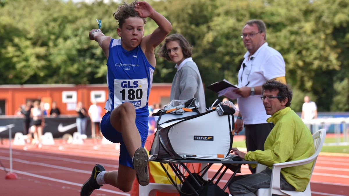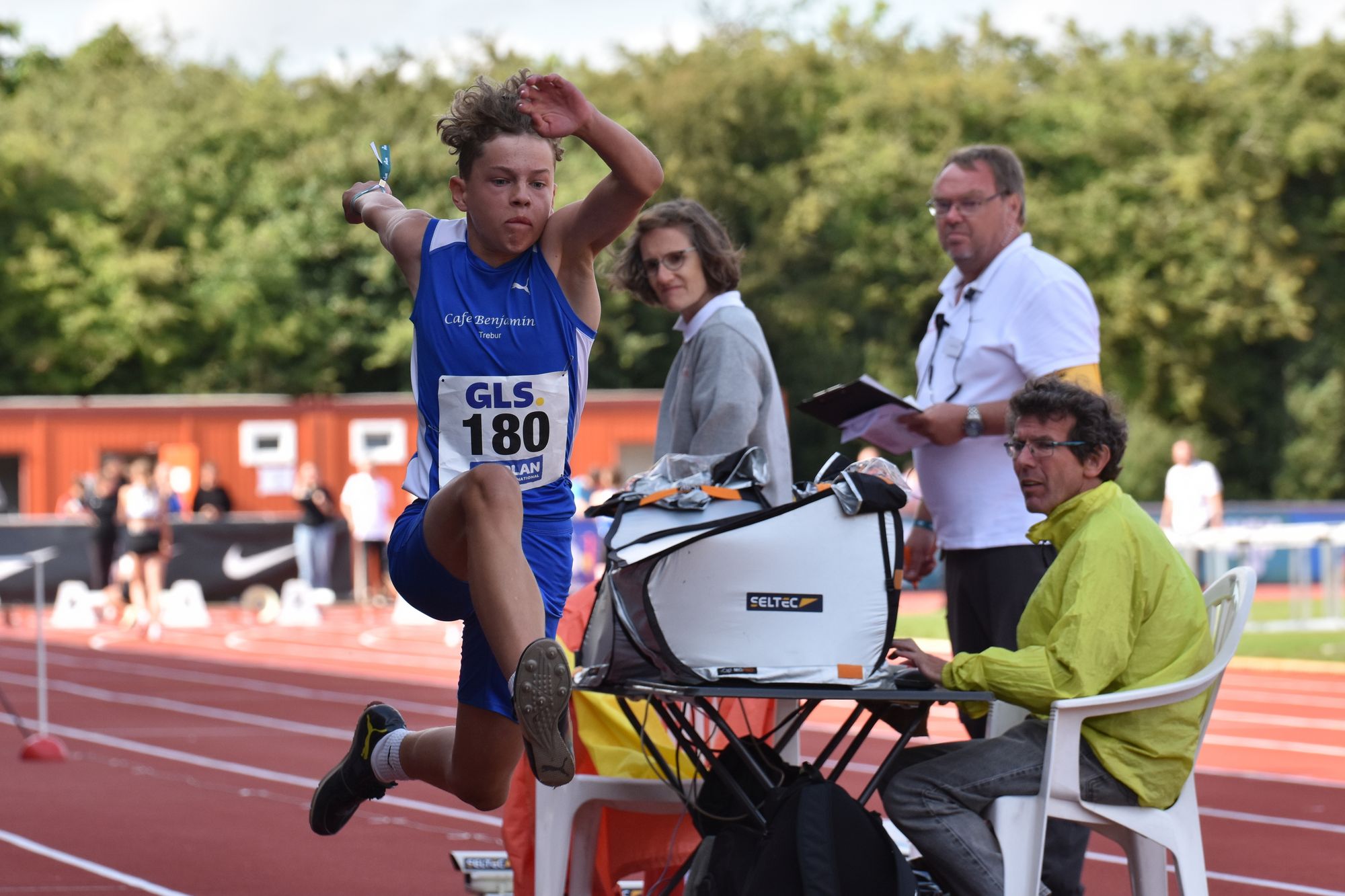 Der M15er im Trikot des TV Windecken holte sich in 10,50 Sekunden DM-Gold über die 80 Meter Hürden und steigerte damit seine Meldeleistung um gleich 0,28 Sekunden. Den zweiten Medaillen-Streich gab es über die 100 Meter. Nach 11,07 Sekunden im Vorlauf stürmte Tom im Finale mit 10,92 Sekunden als Zweiter über die Ziellinie, wurde hier aber leider von einem zu starken Rückenwind (+ 2,9 m/sec.) angetrieben. Niklas Becker (SG Egelsbach) beendete das Finale nach 11,53 Sekunden als Siebter.