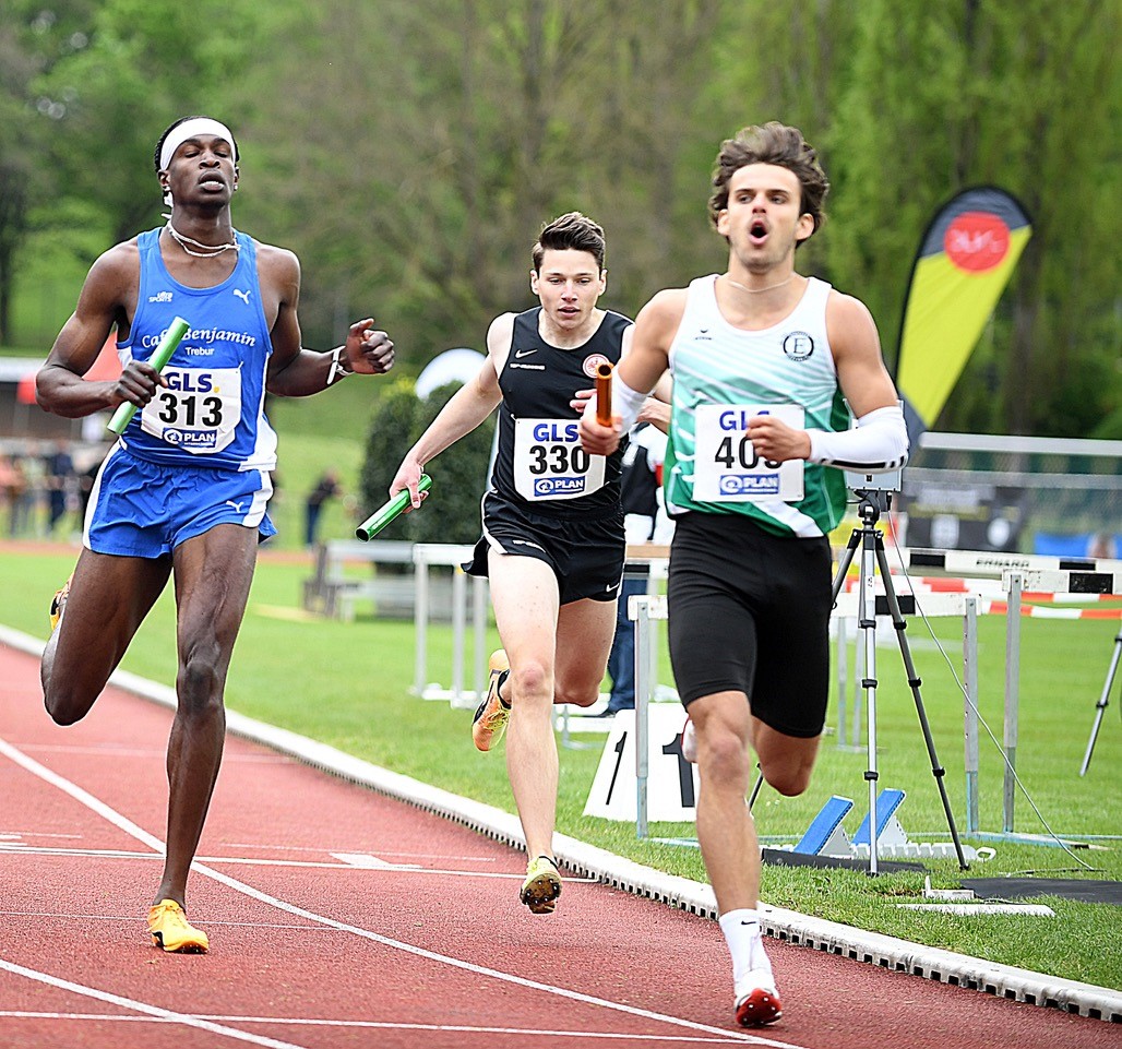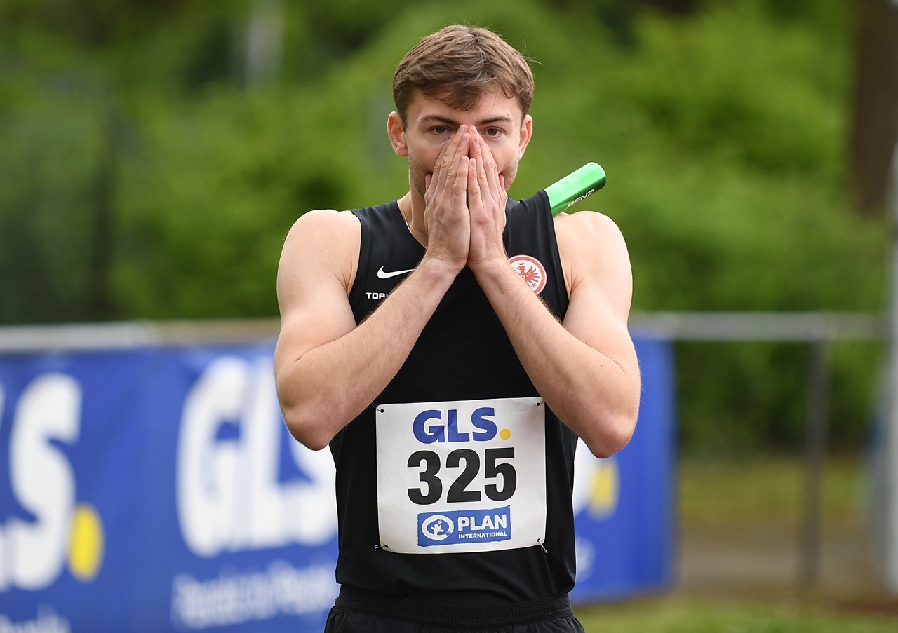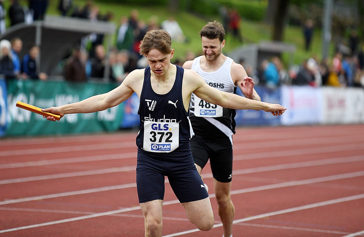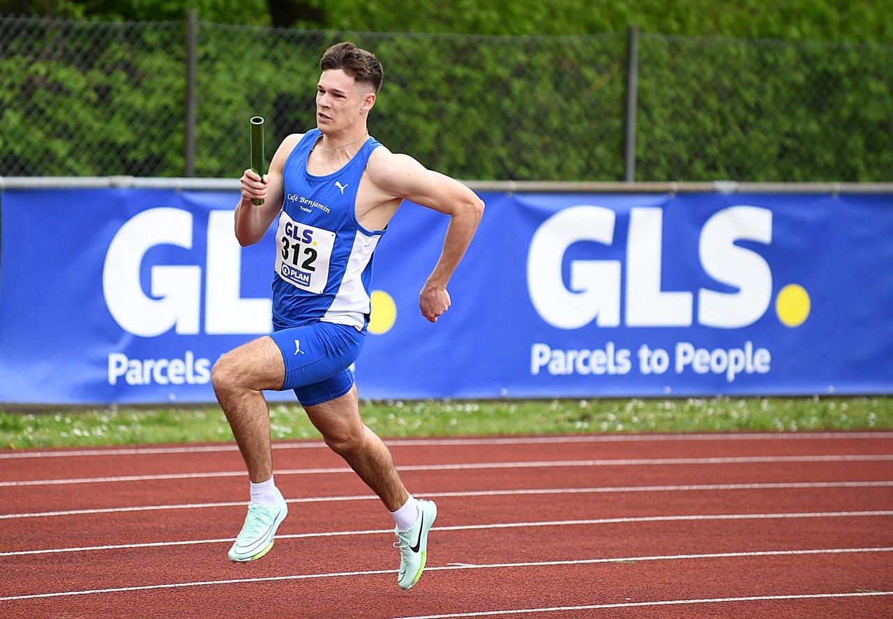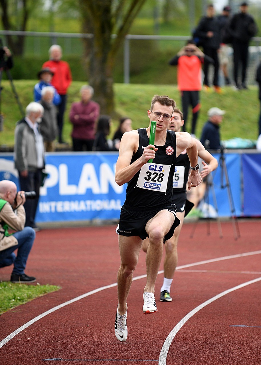 Nach den drei ersten Athleten (Maurice Andrew, Yanik Can Enders und Erik Schmerler - alle TVGG) lagen die Hessen auf dem sechsten Platz. Dann legte Okai Charles los. Als es in die letzte Kurve ging, hatte sich der KLVler schon weiter nach vorne gearbeitet und in Position gebracht. Der knapp zwei Meter große Bundeskaderathlet stürmte mit Vollgas in Richtung Zielgerade, sammelte mit einem harten Finish noch Gegner ein und lief die Startgemeinschaft so noch auf den Bronzerang. „Okai hat sich seinen Part bestens eingeteilt und ist auch taktisch gut gelaufen. Den Schlussläufer kann man auch gut rausstoppen. Ich habe hier eine fliegend gelaufene Zeit von 46,6 Sekunden auf der Uhr. Das ist richtig stark“, freute sich auch Bundestrainer Georg Schmitt. Das „hessische Duell“ gegen Eintracht Frankfurt in dieser Klasse entschied die Startgemeinschaft zu ihren Gunsten. Es war aber eine knappe Angelegenheit. Die vier Adlerträger (Daniel Borchard, Tim Peters, Philip Hennemuth, Philip Stahl) mussten nach 3:19,46 Minuten mit dem ungeliebten vierten Platz zufrieden sein.