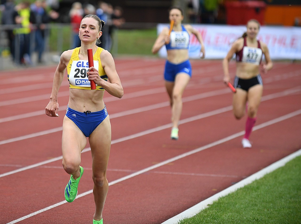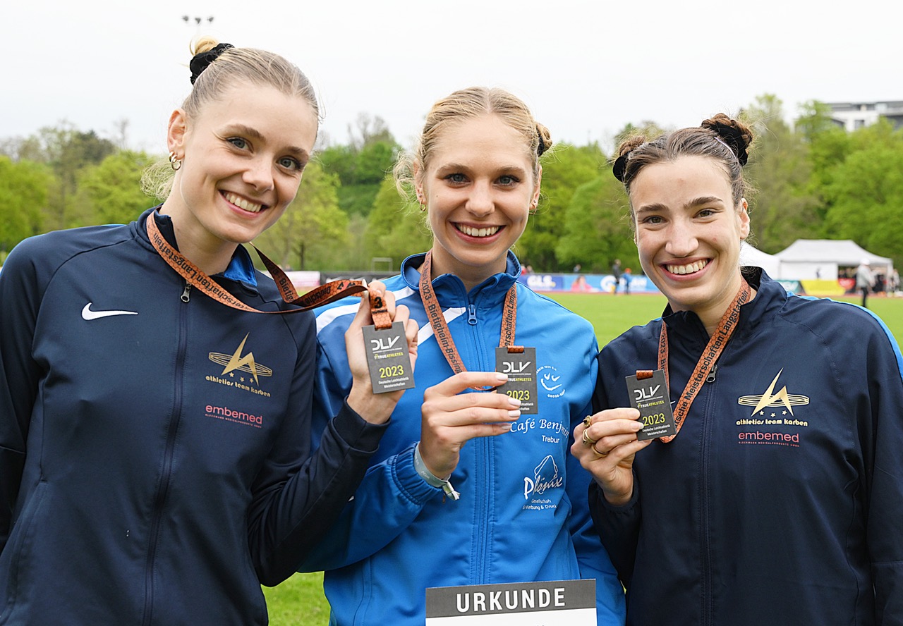 Kommen wir zu den 3x800 Metern bei den Frauen. Hier gehörte die Startgemeinschaft „Karben/Königstein/Groß-Gerau“ von der Papierform zu den klaren Anwärtern auf Edelmetall. Top-Favorit war hier die Läuferinnen der LAV Stadtwerke Tübingen, die dann ihrer Favoritinnen-Rolle auch vollauf gerecht wurden. Nachdem die Konkurrenz den beiden ersten LAV-Athletinnenn (Laura Wilhelm & Carolin Führen) noch einigermaßen folgte konnte, machte Schlussläuferin Hanna Klein dann den Deckel drauf. Die Hallen-Europameisterin von Istanbul (3000 m) zeigte, dass sie auch auf der Unterdistanz bärenstark ist. Die Tübingerinnen verteidigten schließlich mit 6:30,66 Minuten souverän ihren DM-Titel. Im Kampf um die Vizemeisterschaft lieferten sich der ASV Köln und die Startgemeinschaft aus Hessen ein extrem spannendes Duell bis zum letzten Meter. Schon bei der Hallen-DM in Dortmund trafen die beiden Teams aufeinander. Damals holten die Rheinländerinnen den Titel. Und auch jetzt hatten die ASV-Frauen das bessere Ende für sich. Auch diesmal musste sich Schlussläuferin Lara Tortell (Karben) erneut Vera Coutellier (Köln) knapp geschlagen geben. Zuvor drehten Sophia Wolf (Groß-Gerau) und Marie Burchard (Karben) ihre Runden. In Summe brachte das Trio 6:33,06 Minuten in die Wertung, winzige 0,03 Stunden hinter den Kölnerinnen.