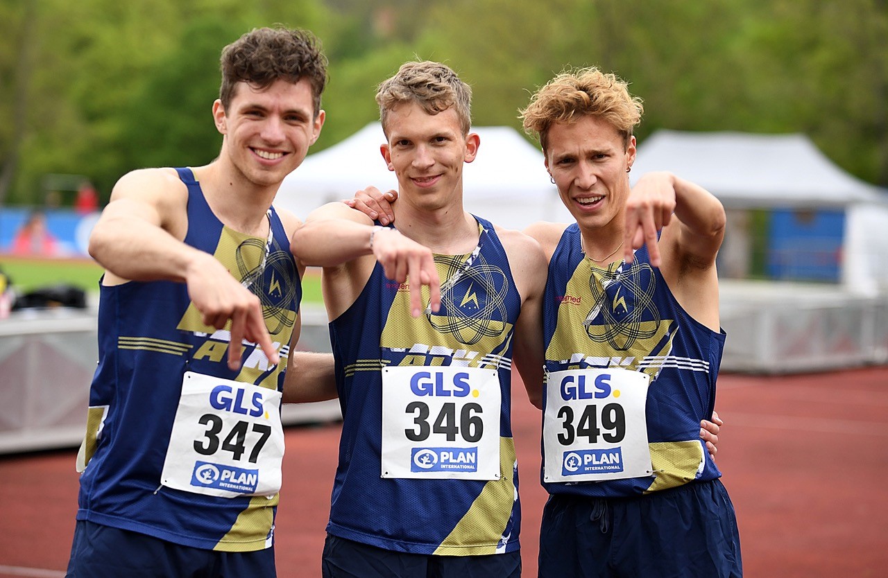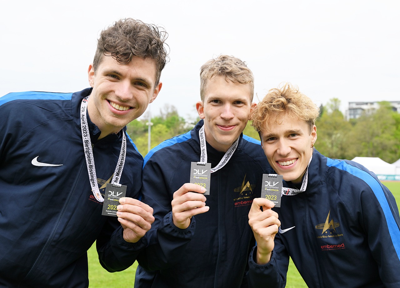 Nicht minder spannend verliefen die 3x1000 Meter bei den Männern. Eigentlich waren die Mannschaften der LSC Höchstadt/Aisch und des SC DHfK Leipzig der Konkurrenz schon enteilt, als die Schlussläufer auf den finalen Part gingen. Die Verfolger konnten letztendlich die Enteilten noch einholen, so dass auf einmal gleich fünf Teams fast nebeneinander auf die Zielgerade einbogen. Die „besten Beine“ hatten dann die Bayern der LSC Höchstadt/Aisch mit 7:18,35 Minuten. Dahinter sicherte Marc Tortell mit einem fulminanten Endspurt dem Athletics Team Karben in 7:18,55 Minuten die deutsche Vizemeisterschaft. Niklas Harsy hatte die Staffel aus der Wetterau angelaufen und dann das Holz an Neuzugang Jan Dillemuth (noch U20) übergeben. Der deutsche Hallenmeister machte seine Sache prima und ließ nie größere Lücken entstehen. Bereits bei der Staffel-DM 2022 in Mainz hatten sich die Karbener die Silbermedaille geholt. Das Podium der Top-Drei komplettierte diesmal die LG Farbtex Nordschwarzwald (7:18,77 min.).