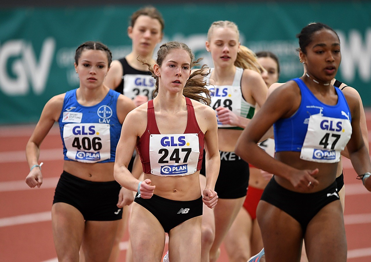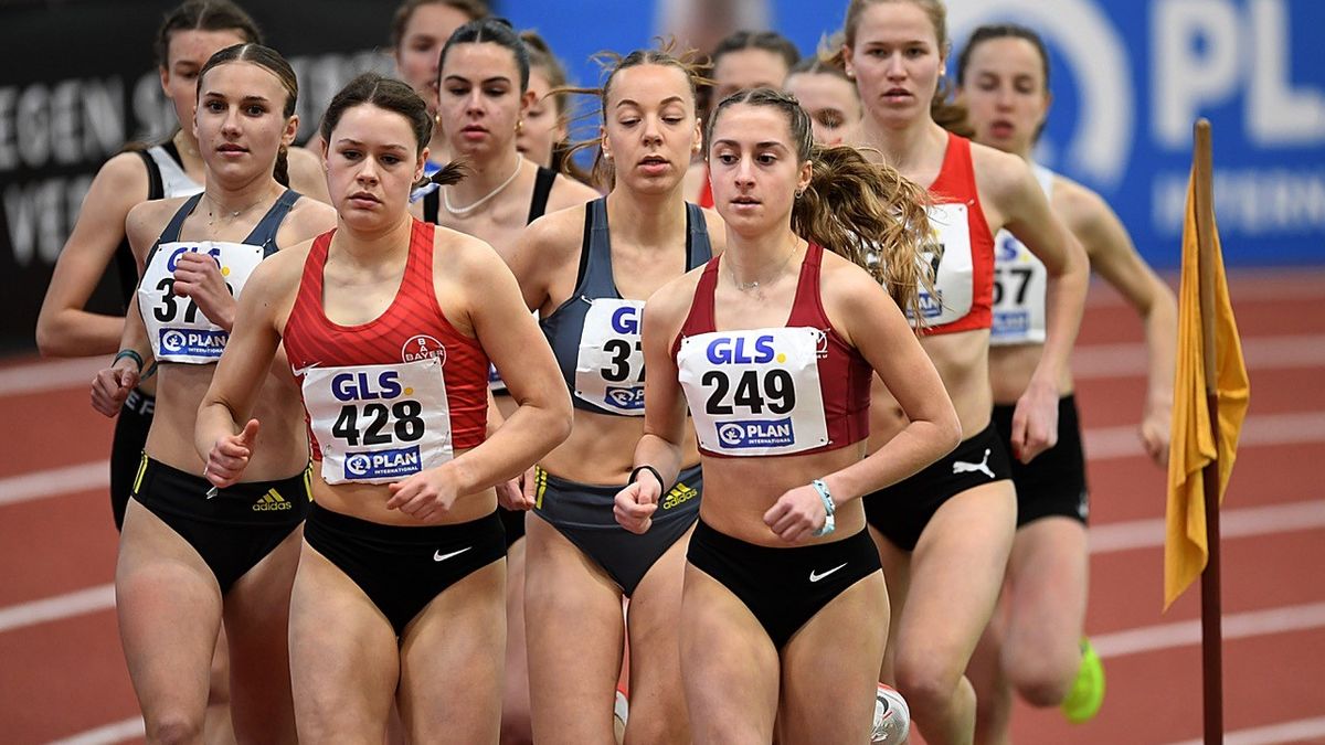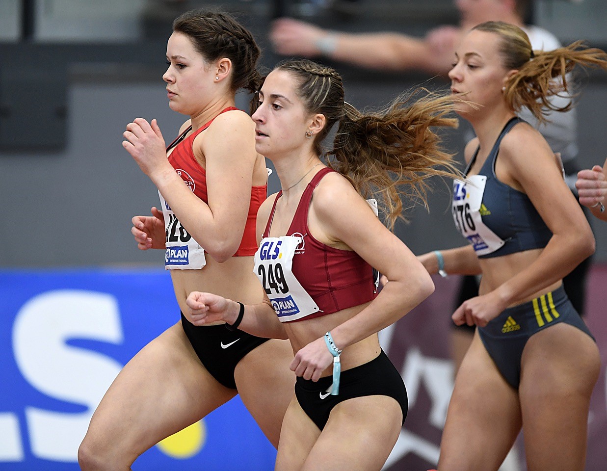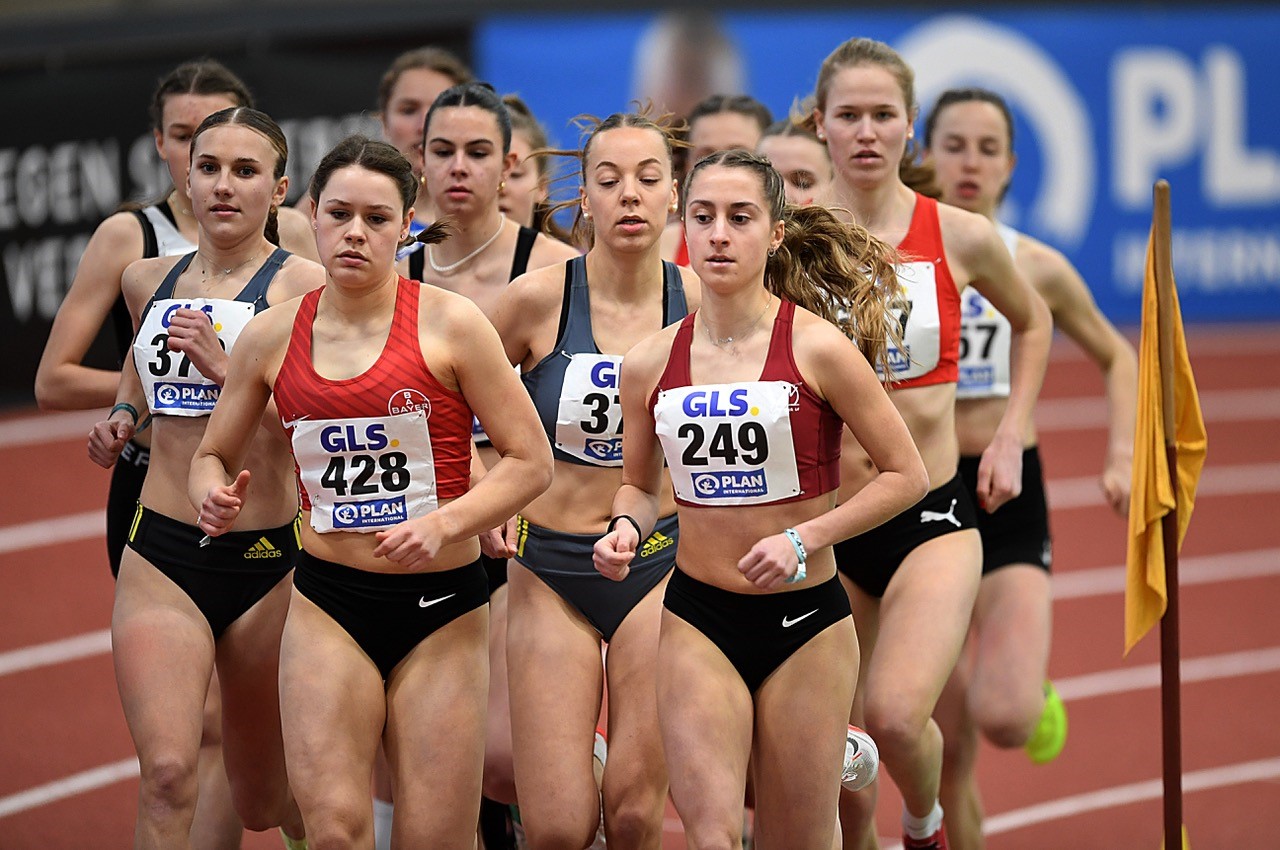 1500 Meter: Fast hätte es über die 1500 Meter auch eine Medaille für Hessen gegeben. Die Fahrt war hier am Anfang nicht übermäßig hoch, so dass Sarah Köcher (Königsteiner LV) auf den ersten 500 Meter selbst fürs Tempo sorgte. Vier Runden vor Schluss wurde es dann flotter, die KLVlerin war immer noch mit in der Spitzengruppe dabei, ehe sie in der Endphase etwas abreißen lassen musste. Mit der neuen Hallenbestzeit von 4:38,53 Minuten wurde Sarah Vierte. „Damit bin ich absolut zufrieden. Die letztendlich Drittplatzierte kam in der letzten Kurve von hinten, da konnte ich einfach nicht mehr hochschalten. Jetzt freue ich mich auf eine lockere Woche mit deutlich reduziertem Training“, so die Kaderathletin, die im Sommer zur U20 Europameisterschaft will.