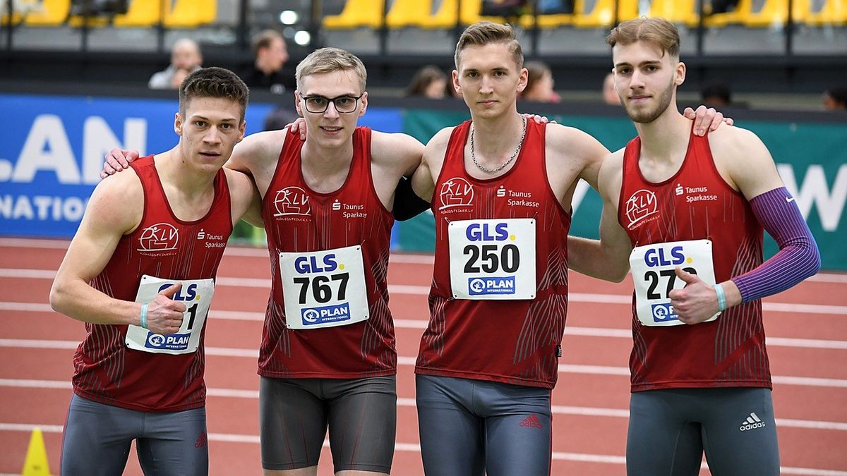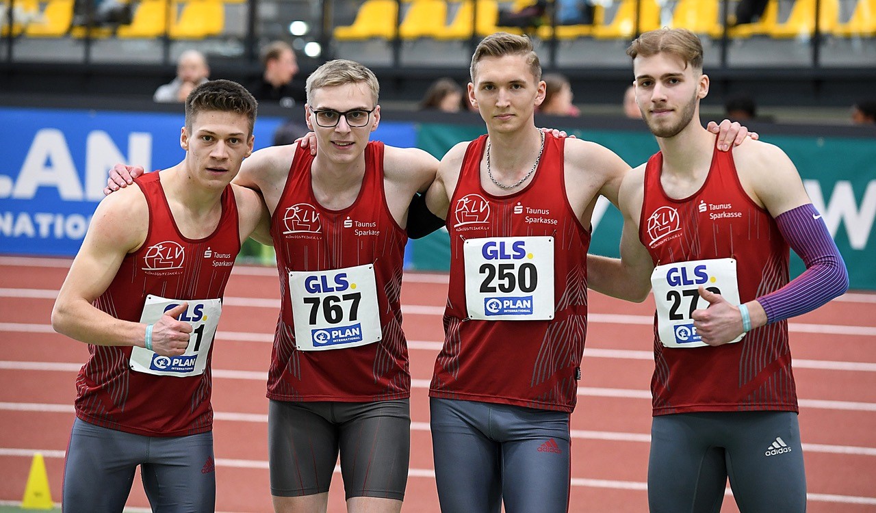 4x200 Meter: Nichts für schwache Nerven waren die Staffelläufe. In fünf Rennen stritten die 27 Teams um die Medaillen und gute Zeiten. Zum Auftakt hatte der SC Neunbrandenburg 1:29,77 Minuten vorgelegt. Diese Marke hatte jedoch nur bis zum dritten Zeitlauf Bestand. Hier stand die Startgemeinschaft „Königstein/Groß-Gerau/Kronberg“ auf der Bahn. Die Truppe war mit der drittschnellsten Zeit des Jahres angereist, hatte also Medaillenambitionen. Das Quartett in der Besetzung Lasse Schmitt, Finn Kohlenbach, Sven Müller und Julian Rubel lieferte jedoch drei schlechte Wechsel ab. Trotzdem reichte es in 1:29,36 Minuten zur zwischenzeitlichen Führung. Doch die Freude währte nur kurz, denn wegen eines angeblichen Wechselfehlers erfolgte wenig später die Disqualifikation. Nach einem Gegenprotest durch das Trainerteam und dem Betrachten der Videoaufzeichnungen war die schnelle Startgemeinschaft aber wieder in der Wertung. Jetzt war Abwarten angesagt, denn die beiden Top-Teams (SC Potsdam & Cologne Athletics) mussten noch ran. Die Jungs des SC Potsdam, als Jahresschnellste in der Meldeliste, konnten mit 1:29,63 Minuten die Hessen nicht abfangen. Dies gelang nur dem Quartett von Cologne Athletics, die beeindruckende 1:27,38 Minuten auf den Tartanbelag zauberten. Der Nachwuchs von Eintracht Frankfurt (Laurin Hanke, Nicolas Ziegler, Tom-Leander Duchardt, Titus Langefeld), Achte in 1:31,78 Minuten, bekam bei der Siegerehrung auch noch die begehrten DM-Urkunden überreicht.