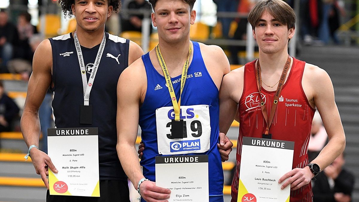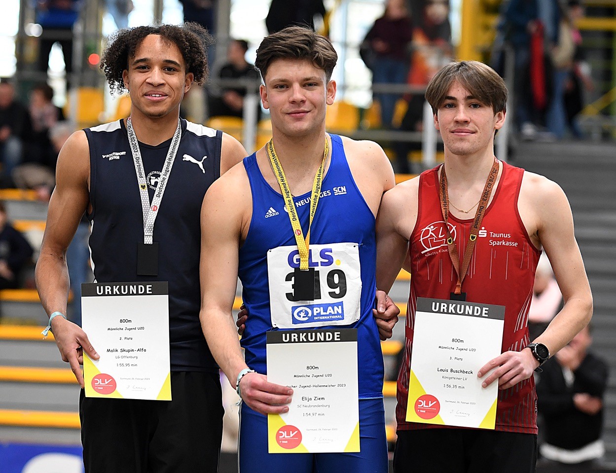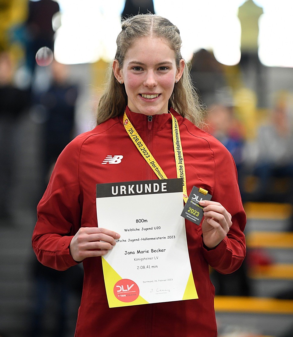 Einen wahren Medaillen-Regen gab es für den Nachwuchs aus Hessen am zweiten Tag der Deutschen Hallen-Meisterschaften in Dortmund. Mit gleich drei Titeln trumpften die Mittel- und Langstrecke mächtig auf. Jana Becker (Königsteiner LV) setzte sich erwartungsgemäß über 800 Meter durch. Auch Jan Dillemuth (Athletics Team Karben) wurde seiner Favoritenrolle über 1500 Meter vollauf gerecht. Hinzu kam noch Gold über 3000 Meter durch Tristan Kaufhold (SSC Hanau-Rodenbach).