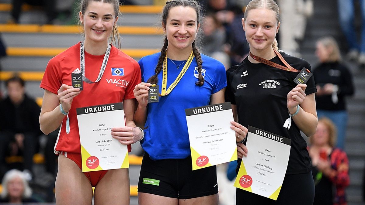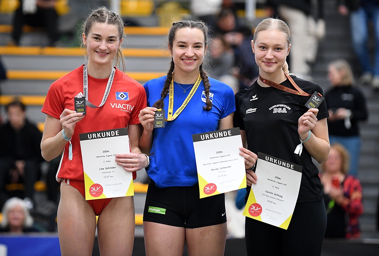 200 Meter: Carolin Schlung (SSC Bad Sooden-Allendorf) holte sich nach dem dritten Platz am Vortrag über 60 Meter (7,49 sec.) nun auch auf der Hallenrunde die Bronze-Medaille. Fünf Starts innerhalb von gut 24 Stunden sind schon ein strammes Programm. Mit 24,36 Sekunden war die Teilnahme am A-Finale klar. Hier standen dann 24,50 Sekunden auf der Urkunde. Vivian Groppe (MT Melsungen) kam mit 25,62 Sekunden nicht an ihr normales Leistungsniveau ran. Fürs B-Finale wären 25,49 Sekunden nötig gewesen. Auch für Melina Höfer (TV Gelnhausen/26,36 sec.) und Raphaella Zali (TSG Wehrheim/26,67 sec.) war in der ersten Runde Endstation.