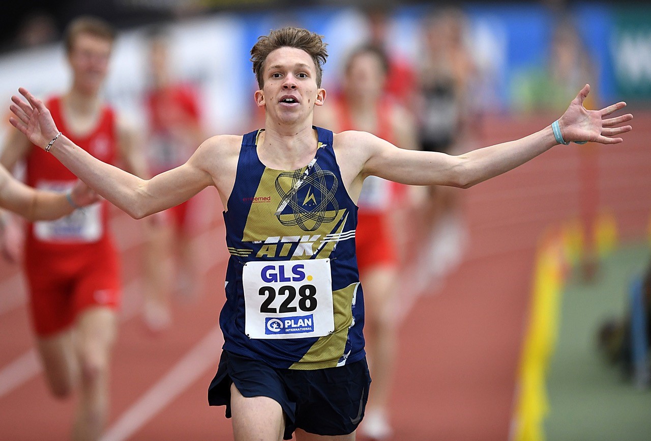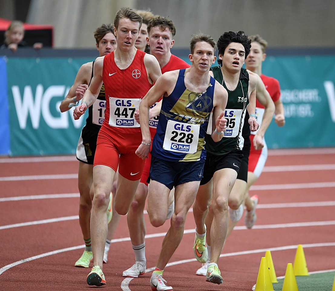 3000 Meter: Noch enger als bei den 1500 Metern ging es bei der längsten Hallen-Distanz zur Sache. Es dauerte eine ganze Weile, ehe sich das 19-köpfige Feld sortiert und dann auch langsam auseinander gezogen hatte. Tristan Kaufhold (SSC Hanau-Rodenbach), Teilnehmer bei der U18-EM in Jerusalem, behielt immer die Übersicht und arbeitete sich in der entscheidenen Phase immer weiter nach vorne. Dann ging’s los. Tristan (noch U18) lief einen tollen Spurt und stürmte nach den fünfzehn Runden in 8:29,33 Minuten als neuer deutscher Meister vor Silas Zahlten (LG Brillux Münster/8:30,57 min.) über die Ziellinie. Jakob Dieterich (LT Kassel) beendete das Rennen nach 9:02,14 Minuten auf Position fünfzehn.