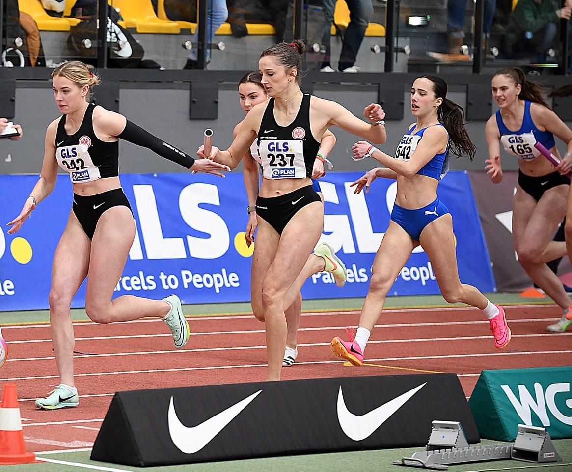 4x200 Meter: Die Eintracht-Staffel (Julia Badenhausen, Finja Köchling, Svenja Sbrzesny, Carmen Nowicka) beendete die DM auf dem zehnten Platz und war mit 1:43,20 Minuten etwas schneller unterwegs als bei den „Hessischen“. Die Startgemeinschaft „Darmstadt/Gelnhausen/Wehrheim“ in der Besetzung Melina Höfer, Louisa Grauel, Raphaella Zali und Leticia Puknus fand sich nach 1:44,11 Minuten auf Position vierzehn wieder.