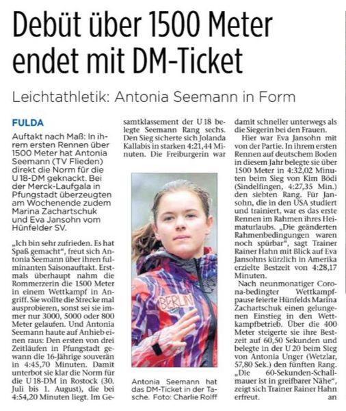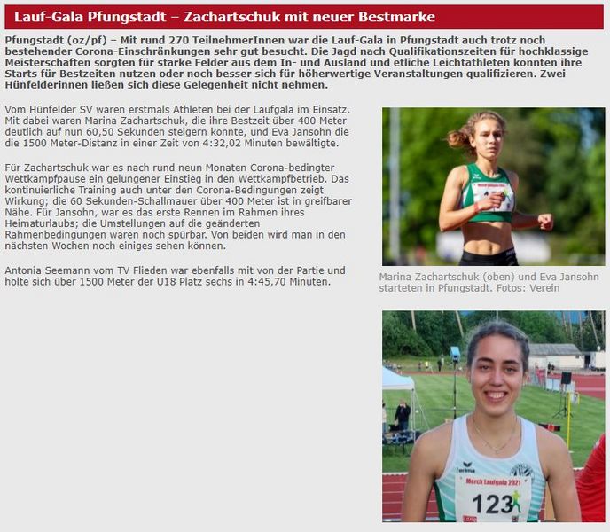 Vom Hünfelder SV waren erstmals Athleten bei der Laufgala im Einsatz. Mit dabei waren Marina Zachartschuk die ihre Bestzeit über 400m deutlich auf nun 60,50 Sekunden steigern konnte und Eva Jansohn die die 1.500m-Distanz in einer Zeit von 4:32,02 Minuten bewältigte.