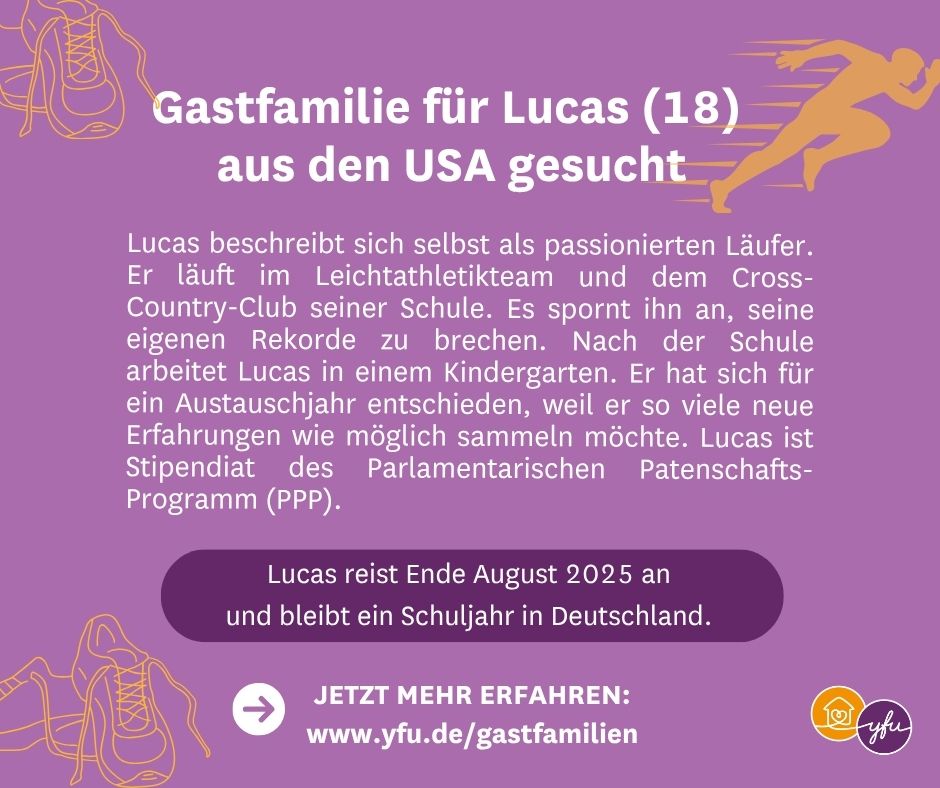 Die gemeinnützige Austauschorganisation Youth For Understanding (YFU) sucht deutschlandweit dringend eine Gastfamilie für den Austauschschüler Lucas (18) aus den USA, der sich selbst als passionierten Läufer beschreibt. Er ist im Leichtathletik-Team seiner Schule und trainiert zudem im Cross-Country-Club.