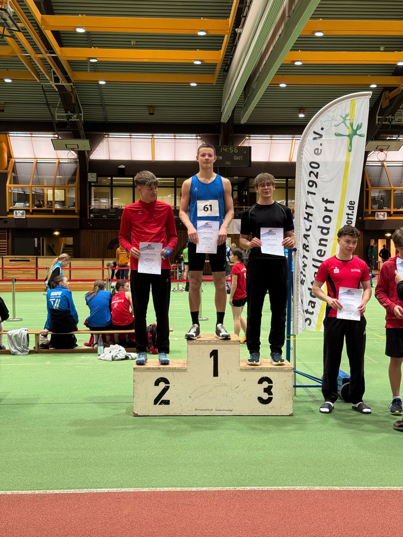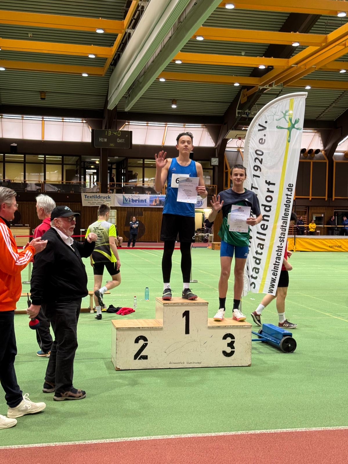 Über tolle Platzierungen und ebenfalls einige persönliche Bestleistungen (PB )freuten sich auch die U16 und U18 Athleten Finn Peters, Diego Panezi und Daniel Benner. Finn sicherte sich mit neuer PB im Hochsprung (1,63m) den 1.Platz, sowie Platz 3 im Weitsprungfinale (5,32m). Über 60m verbesserte er seine bis dato stehende Bestleistung auf 7,97sek. Etwas schneller und damit auch auf dem Treppchen im U16 Sprint war sein Teamkollege Diego. Dieser steigerte sich auf 7,91sek und wurde mit Platz 3 belohnt. Mittelhessischer Meister über 60m der U18 darf sich seit dem Wochenende Daniel Benner nennen. Er ließ der Konkurrenz keine Chance und freute sich am Ende über eine sehr gute Zeit (7,38sek), sowie Platz 1.