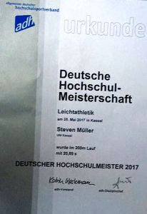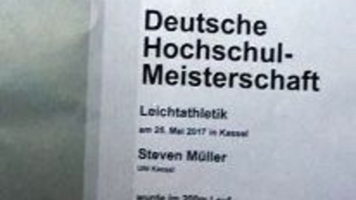 Die Nachricht des Vatertags, exakter die Nachricht aus hessischer Sicht von den Deutschen Hochschulmeisterschaften im Auestadion Kassel, kam von Steven Müller. Denn der Sprinter von der LG ovag Friedberg-Fauerbach, geboren und Student in Kassel, gewann die 100 Meter (10,41) und 200 Meter (20,89). Zwei hochwertige persönliche Rekorde, zwei Zeiten, mit denen er sich in der ewigen hessischen Bestenliste über beide Strecken unter die besten Zehn schob. Müller („Mir fehlen einfach die Worte, ich bin überglücklich“) war sogar dem Hessischen Rundfunk einen Fernsehbeitrag wert - zum Film geht es hier - los geht’s bei Minute 15. Und dann knappe 240 Sekunden. Dass in dem Beitrag die fachlich nicht belastbare Formulierung „… der neue Usain Bolt werden…“ vorkommt, wollen wir an dieser Stelle nicht verschweigen. Sicher ist: Müller ist weiter auf dem Weg in die nationale Spitze, und sein Doppelsieg war eine erste Kampfansage an die beiden anderen hessischen Topsprinter. Michael Pohl wurde jeweils Zweiter (10,43/21,26), Florian Daum (beide Wiesbadener LV) beim Comeback nach seiner schweren Schulterverletzung im Winter Fünfter (10,70) und Vierter (21,45).<ENDE/>