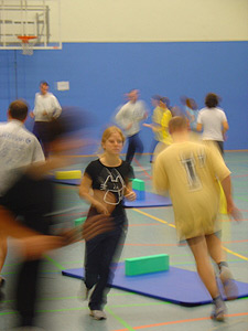 Solch eine Ausbildung gab es am vergangenen Wochenende im Landessportbund Hessen. Die fast 50 Teilnehmer der Veranstaltung, unter Leitung von Dominic Ullrich (HLV Lehrteam und DLV-Projektgruppe „Kinder in der Leichtathletik“) und Yvonne Ripper, erhielten wichtige theoretische Grundlagen der motorischen Entwicklung, Methodik und Didaktik der Kinderleichtathletik, sowie Planungshilfen für abwechslungsreiche Trainingseinheiten für Kinder. In der Praxis wurden die grundlegenden Bewegungsbereiche Laufen, Springen und Werfen, aber auch Spielen, Turnen und Gymnastik konzentriert, aber auch mit viel Spaß gemeinsam ausprobiert. Selbst das schlechte Abschneiden der Fußballer der Eintracht Frankfurt, beim zeitgleich stattgefundenen Bundesligaspiel in der benachbarten Commerzbank-Arena, konnte die gute Stimmung des Lehrgangs nicht trüben.