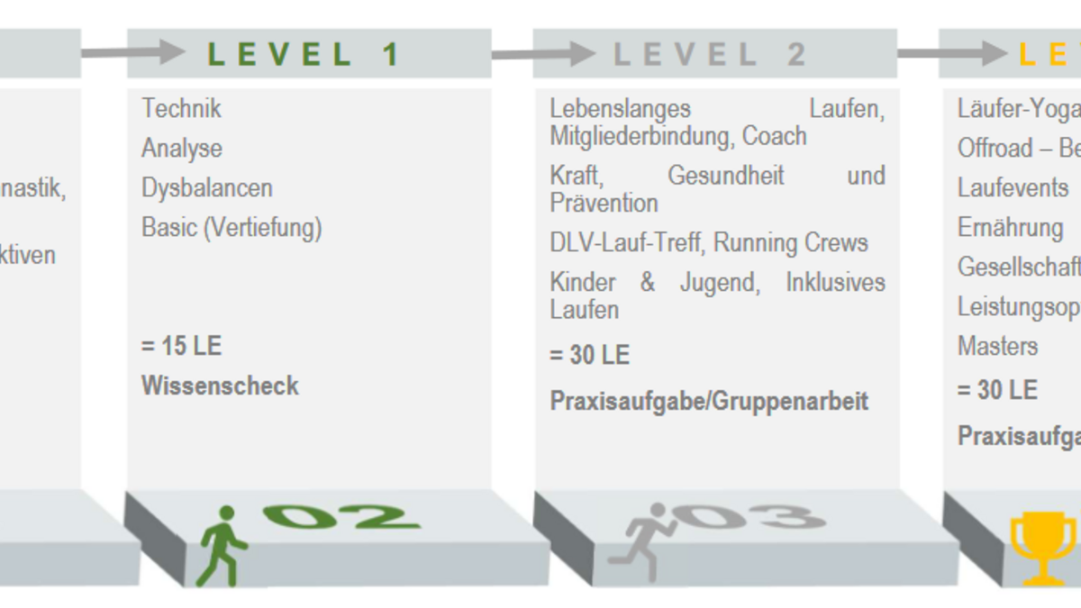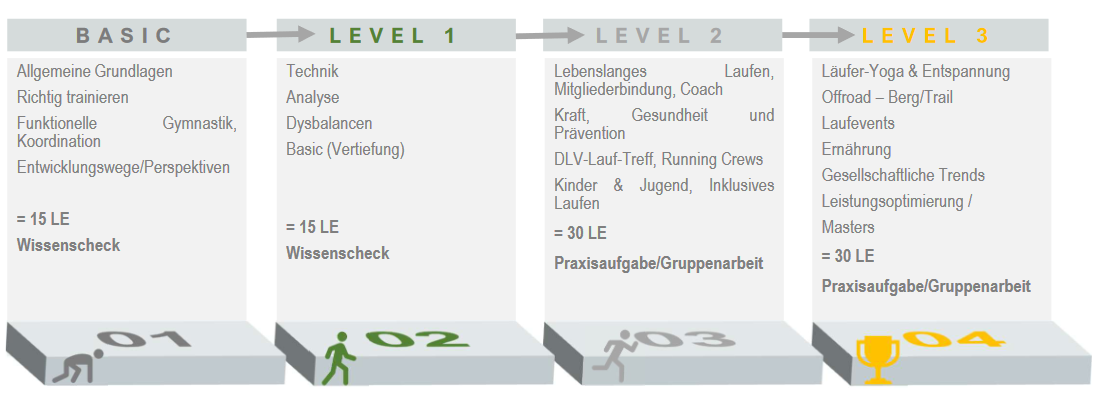 Diese Ausbildung besteht aus einem 4-Stufenmodell und stellt ein neues bundeseinheitliches Bildungsformat des Deutschen Leichtathletik-Verbandes und seiner Landesverbände dar. Dabei wurden Inhalte aus den Grund- und Weiterbildungen zum Lauf- und Walking-TREFF-Betreuer sowie -Leiterüberarbeitet und auf den neusten Stand gebracht.
