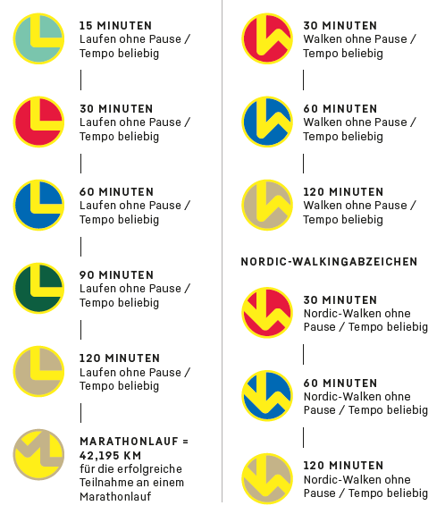 Im Zuge der Umstellung der Corporate Identity des DLV gibt es ab August 2024 neue Designs für alle Lauf-, Walking- und Nordic-Walkingabzeichen sowie Ausweise. Die altbekannten Stufen innerhalb der Abzeichen und Ausweise bleiben hiervon unberührt. Neu ist ebenfalls, dass es keine separaten Wiederholungsabzeichen und -ausweise mehr im neuen Design gibt. Die Ausweiskarten wurden so gestaltet, dass Wiederholungsprüfungen hier eingetragen werden können.