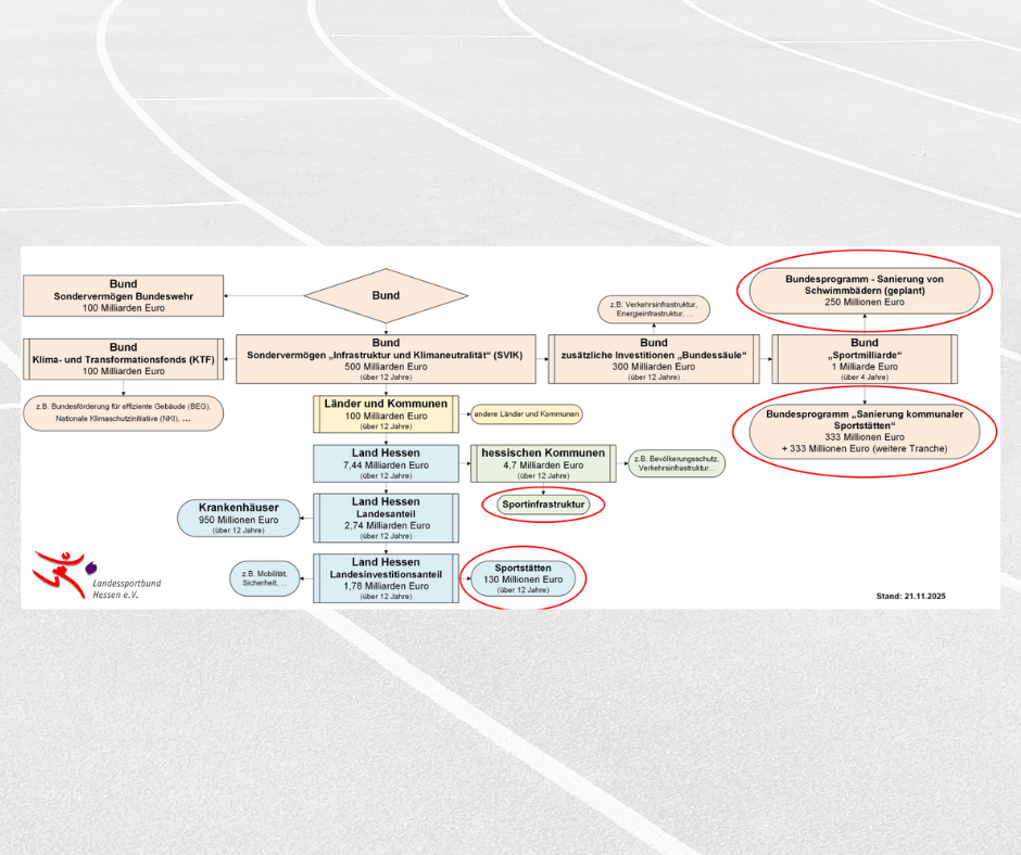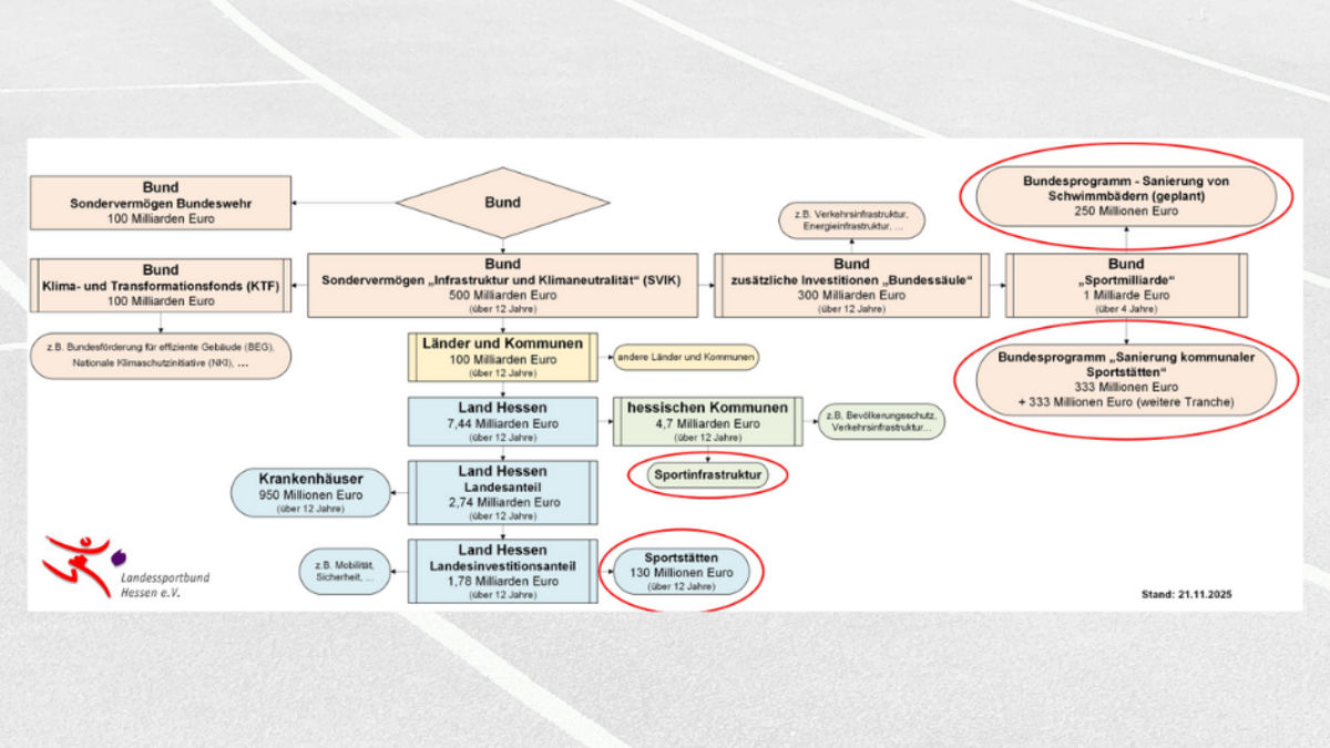 Von den 7,44 Milliarden Euro des hessischen Anteils am bundesweiten Sondervermögen gehen 4,7 Milliarden Euro direkt an die Kommunen. Diese können die Mittel über zwölf Jahre aus acht Handlungsfeldern frei verwenden – darunter ausdrücklich "Sportinfrastruktur". Zusätzlich stehen dem Hessischen Sportministerium 130 Millionen Euro für bestehende Förderlinien zur Verfügung.
