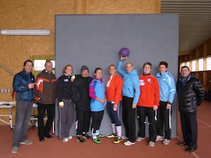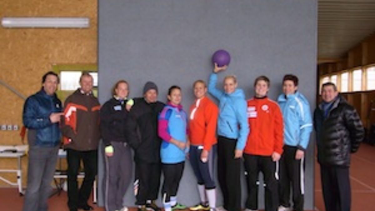 Drei mal drei Meter groß, mit hellblauem Filzbezug und dicken Eisenstützen auf der Rückseite. So präsentiert sich die nagelneue Medizinball-Prellwand des Hessischen Leichtathletik-Verbandes im Wurfhaus des Werferzentrums an der Frankfurter Hahnstraße. Zur Einweihung sind Hammerwurf-Europameisterin Betty Heidler und die Disziplinkolleginnen Kathrin Klaas, Andrea Bunjes und Mareike Nannen gekommen, dazu die EM-Siebte im Diskuswurf, Sabine Rumpf, und Julia Bremser. Sie alle werden künftig in den Genuss dieses neuen Trainingsmittels kommen. Der Olympiastützpunkt Hessen hat die neue Wand gesponsert. „Dafür sind wir sehr dankbar“, sagt der Leitende Landestrainer des HLV, Manfred Kehm, bei der Einweihung. „Wir haben das Ziel, international in den nächsten Jahren Medaillen zu holen. Und das Medizinballwerfen gehört da zu den ganz wesentlichen Trainingsmitteln. Bisher hatten wir hier im Wurfhaus nur nicht die Möglichkeit dazu“, so Kehm. Dank des Olympiastützpunkts Hessen steht die neue Prellwand nun seit einigen Tagen im Wurfhaus und wurde von den Athleten auch schon genutzt. <ENDE/>Werner Schaefer, Leiter des OSP, sagt: „Es ist uns gelungen, Ende vergangenen Jahres noch Mittel bereitzustellen. Die Hessische Sportstätten GmbH hat die Medizinball-Prellwand entworfen und umgesetzt. So konnten wir hier einige Lücken im Trainingsbereich füllen“. Auch die anwesenden Trainer Michael Deyhle und Martin Rumpf zeigten sich von der neuen Wand begeistert: „Eine tolle Sache“, so das einheitliche Urteil.
