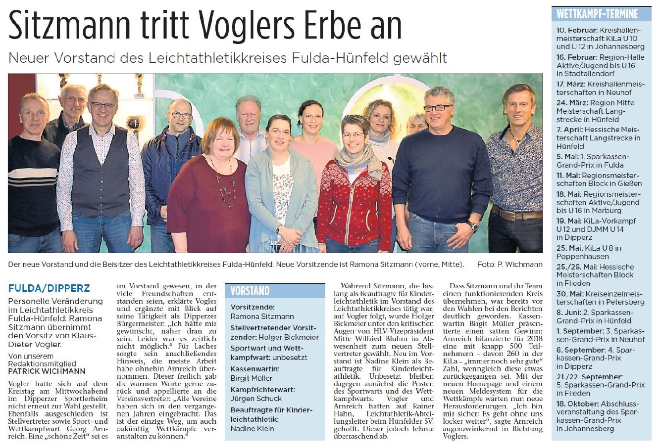 Personelle Veränderungen im Leichtathletikkreis Fulda-Hünfeld. Im Rahmen des Kreistages 2019 wurde der Vorstand neu gewählt. Ramona Sitzmann übernimmt den Vorsitz von Klaus-Dieter Vogler. Holger Bickmeier wurde in Abwesenheit zum neuen Stellvertreter gewählt. Nadine Klein übernimmt von Ramona Sitzmann den Posten der "Beauftragten für Kinderleichtathletik". Birgit Müller wurde als Kassenwartin, Jürgen Schuck als Kampfrichterwart erneut gewählt. Weitere Informationen zum Kreistag können den beigefügten Dokumenten entnommen werden.