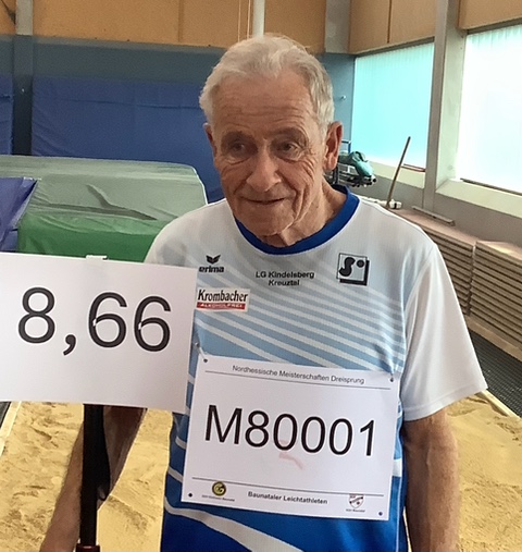 Um 1 cm auf 8,66 Meter verbesserte Dr. Eberhard Linke (LG Kindelsberg Kreuztal) den Hallen-Weltrekord der M80 und löste Edwin Lukens (USA) ab. Für Freiluft-Weltrekordler Dr. Linke wäre eine bessere Weite bei seinen vier gültigen Versuchen möglich gewesen. Leider sprang der Oldie immer vor dem „Brett“ ab.
