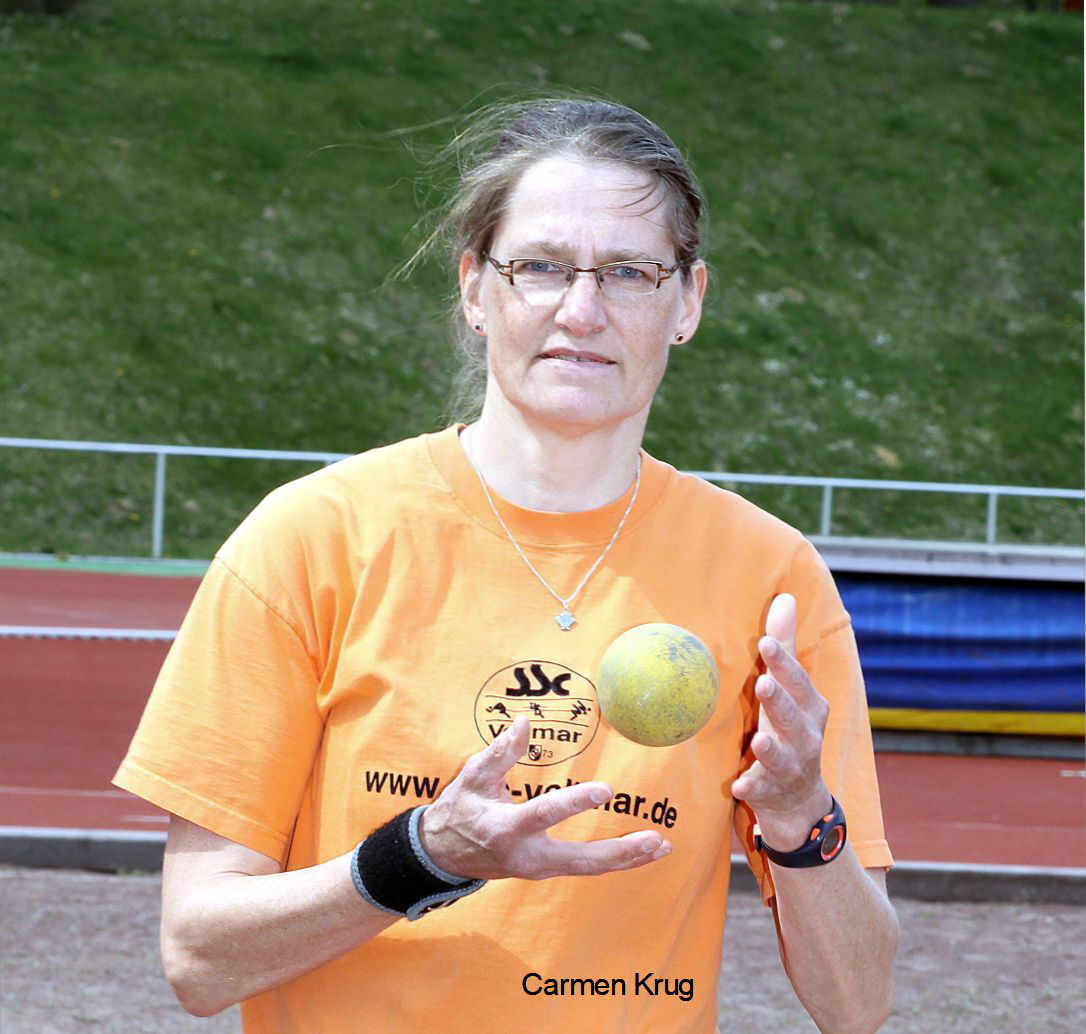 Baunatal - Carmen Krug (Zella) bleibt das heimische Ass in den Wurf-Disziplinen der W 50. Mit 10,80 m trumpfte die für den SSC Vellmar startende Management-Assistentin bei der Senioren-Wurf-Meisterschaft der nordhessischen Leichtathleten in Baunatal im Kugelstoßen (3 kg) auf und wird mit dieser Weite in der aktuellen DLV-Bestenliste hinter Ute Paulsen (HSV Pulsnitz) an zweiter Position geführt. Im Diskuswerfen (1 kg: 29,57 m) ist mit Bettina Schardt (MTG Mannheim) ebenfalls nur eine Athletin auf Bundesebene besser notiert. Lediglich im Hammerwerfen (3 kg: 39,14 m) fehlen zum Bronzerang im DLV zwei Meter.