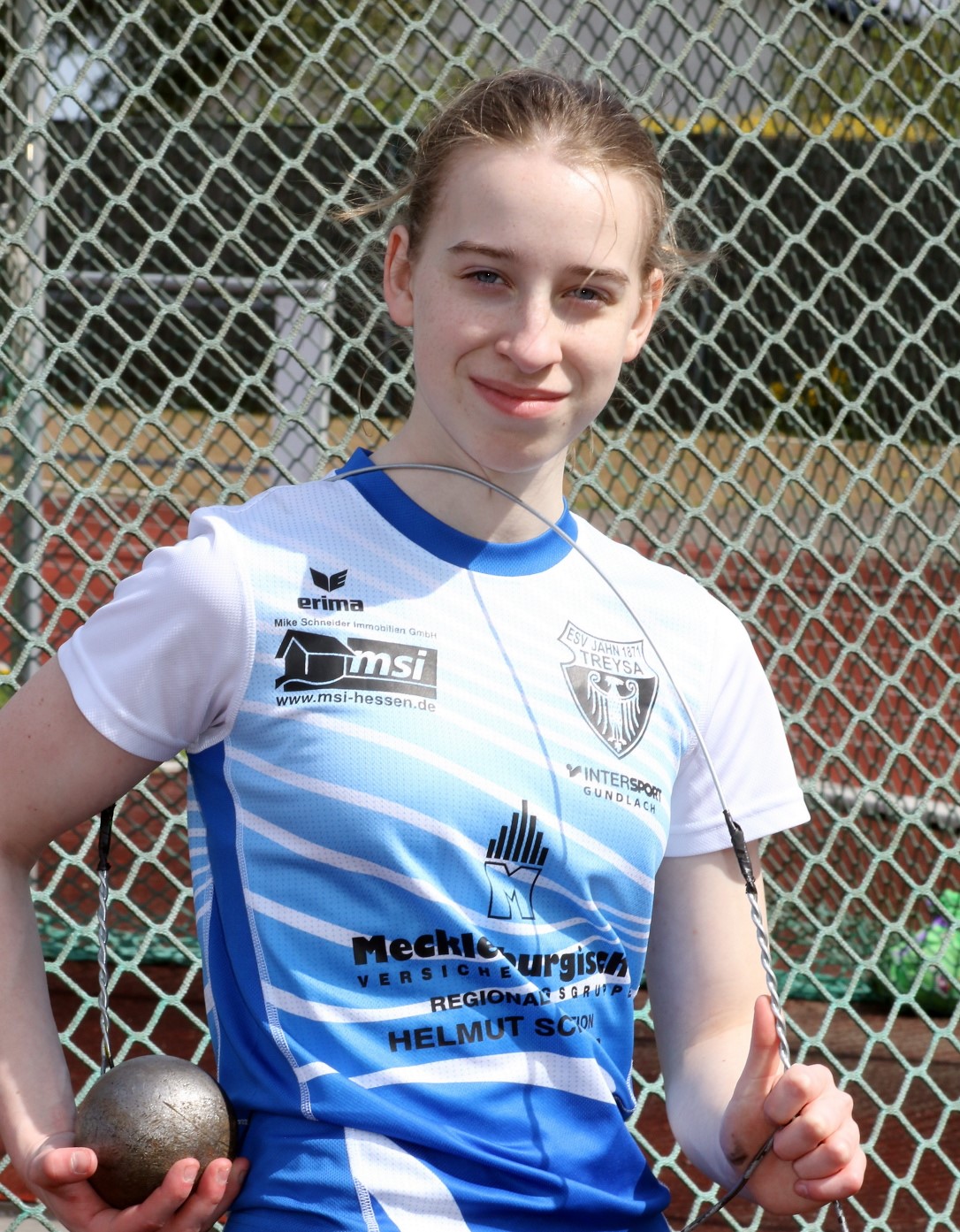 In allen gültigen Versuchen mit dem Spitzenwert von 43,74 Meter (3 kg) übertraf die THS-Schülerin aus Rengshausen im Hammerwerfen der W 15 die Norm für die Deutsche Jugend-Meisterschaft U 16 Ende Juli in Stuttgart und kann sich jetzt in Ruhe mit Trainer Helmut Schneider auf den Auftritt im Musterländle vorbereiten. Mit W 14-Siegerin Leonie Koch (TSV Remsfeld/27,23 m) steht die Nachfolgerin bereits bereit. Doch ihr fehlt noch etwas die Konstanz.