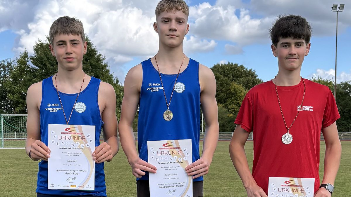 Neben Simon Knüppel (1.) schaffte Ivo Anders (Homberger Turnerschaft) als Dritter im Vierkampf der M 14 mit 1657 Punkten ebenfalls den Sprung aufs Treppchen. Die Steigerung im Kugelstoßen auf 9,73 Meter (4 kg) ist die Tages-Bestleistung in dieser Altersklasse. Noch in dieser Saison will der Theodor-Heuss-Schüler die Zehn-Meter-Marke schaffen.