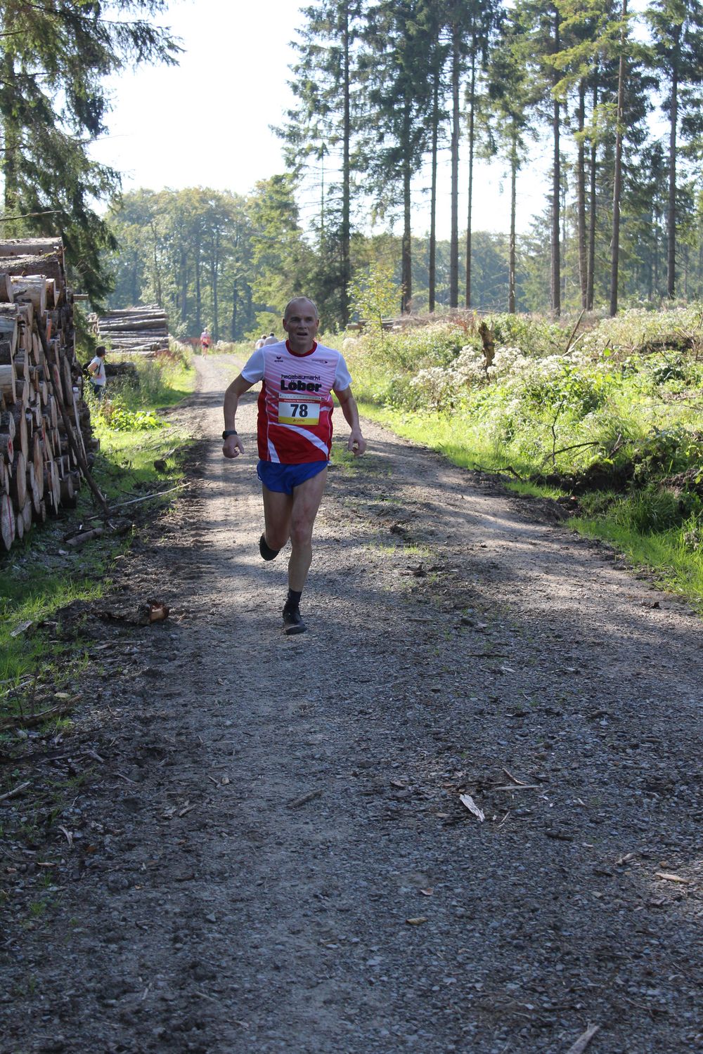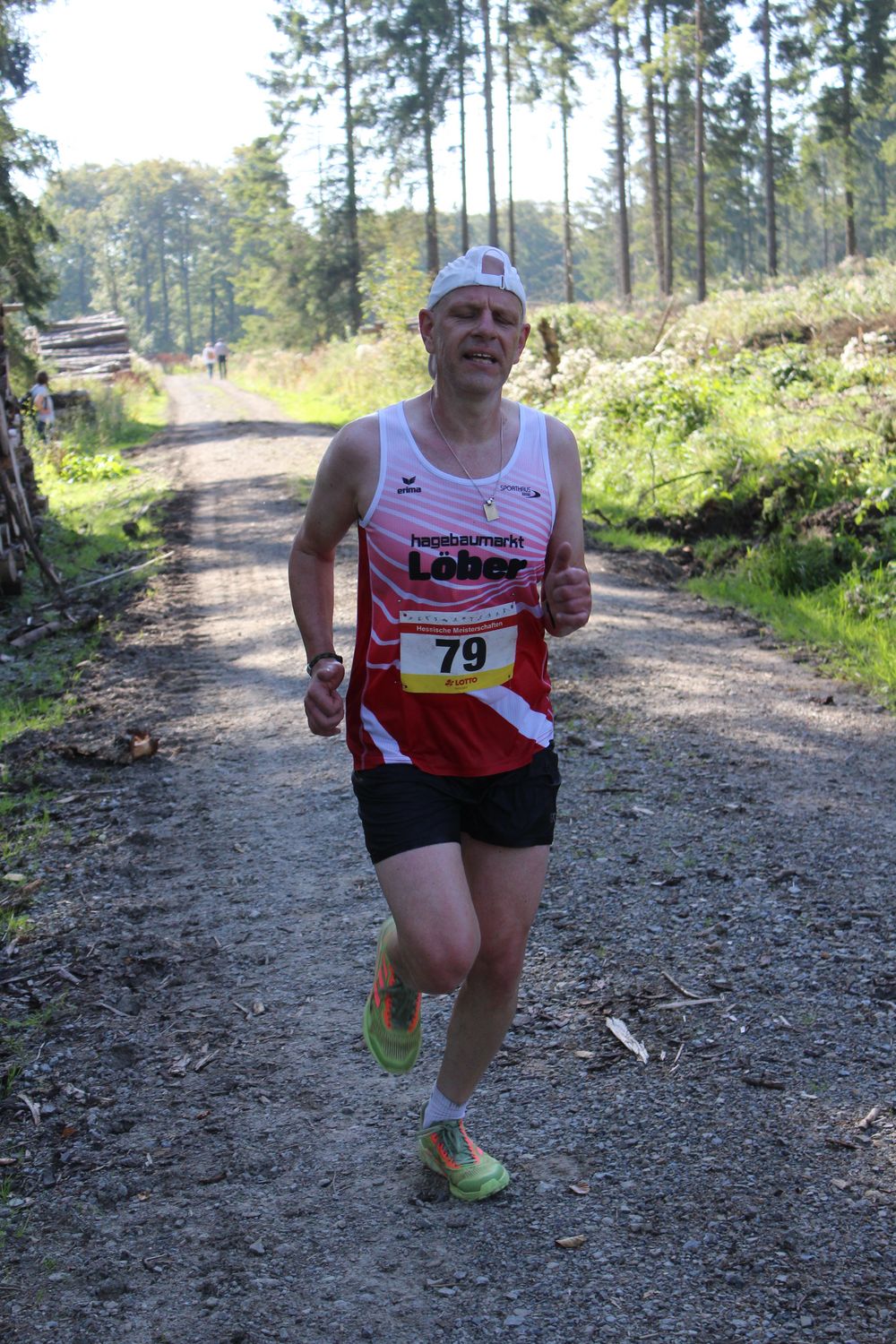 Bei Jörg Meder (LG Reinhardswald/MTSV Helmarshausen) ging die Vorhersage mit Bronze in der M45 nach der Meldeliste auf. Gegen Titelverteidiger Felix Kaiser (TSV Niederelsungen; 41:39) und den früheren Hessenmeister Andrew Liston (LG Wettenberg; 45:17) war kein „Kraut“ gewachsen. Doch im Kampf um Rang drei setzte sich Meder (51:30) gegen Matthias Lohr (Tuspo Borken; 52:21) und Karl-Uwe Schaub (TSV Niederelsungen; 55:40) durch. „Doch es war ein hartes Stück Arbeit“, sagte ein zufriedener Meder im Ziel. Erst nach fünf Kilometern im steilen Anstieg der Kohlenstraße überholte Meder die Kontrahenten. Während Schaub zurück fiel, heftete sich Lohr noch einige Zeit an die Fersen von Meder und musste dann im Steilstück der früheren Ski-Sprungschanze abreißen lassen.