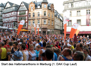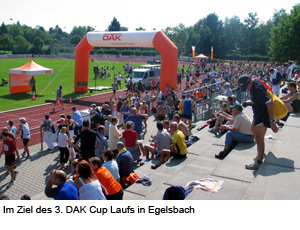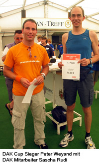 Peter Weyand von der TSG Wixhausen ist der Sieger des erstmals veranstalteten Cups der Deutsche Angestellten Krankenkasse (DAK). Er nahm erfolgreich an den drei Wertungsläufen in Marburg, Klein Karben und Egelsbach teil. „Das war doch ein ziemliches Stück Arbeit“, meinte ein gutgelaunter, aber auch erschöpfter Sieger bei der Ehrung im Rahmen des Koberstädter Waldmarathons. Hinter ihm lagen immerhin zwei Halbmarathon- und ein 10km- Lauf. Angesichts der Veranstaltungsmonate Juli und August eine recht heiße Angelegenheit bzgl. der Temperaturen. Nach diesen drei Läufen durfte sich Peter Weyand über einen Geschenkgutschein freuen. Auch der Zweitplatzierte, Gerhard Schuster, vom TSV Klein Karben freute sich über einen Geschenkgutschein. Er erhielt ihn, ebenso wie Peter Weyand, aus den Händen von Sascha Rudi, der es sich als Repräsentant der DAK - Landesgeschäftsstelle Südwest nicht hatte nehmen lassen, persönlich vor Ort zu sein. Vom Vertreter des Hessischen Leichtathletik - Verbandes, dem Volks- und Straßenlaufwart Jochen Miersch, auf die Teilnehmerzahl des Cups angesprochen, äußerte sich Sascha Rudi zurückhaltend. „Hier gibt es zwar erste Vermutungen über die Ursachen, aber es ist noch verfrüht, jetzt bereits eine eindeutige Aussage zu machen.“ Somit gilt es für beide Partner, die DAK und den HLV zu analysieren und dann zu entscheiden, ob es - vielleicht mit anderer Veranstalterkonstellation - im kommenden Jahr eine Wiederholung geben wird. Jochen Miersch Volks- und Straßenlaufwart