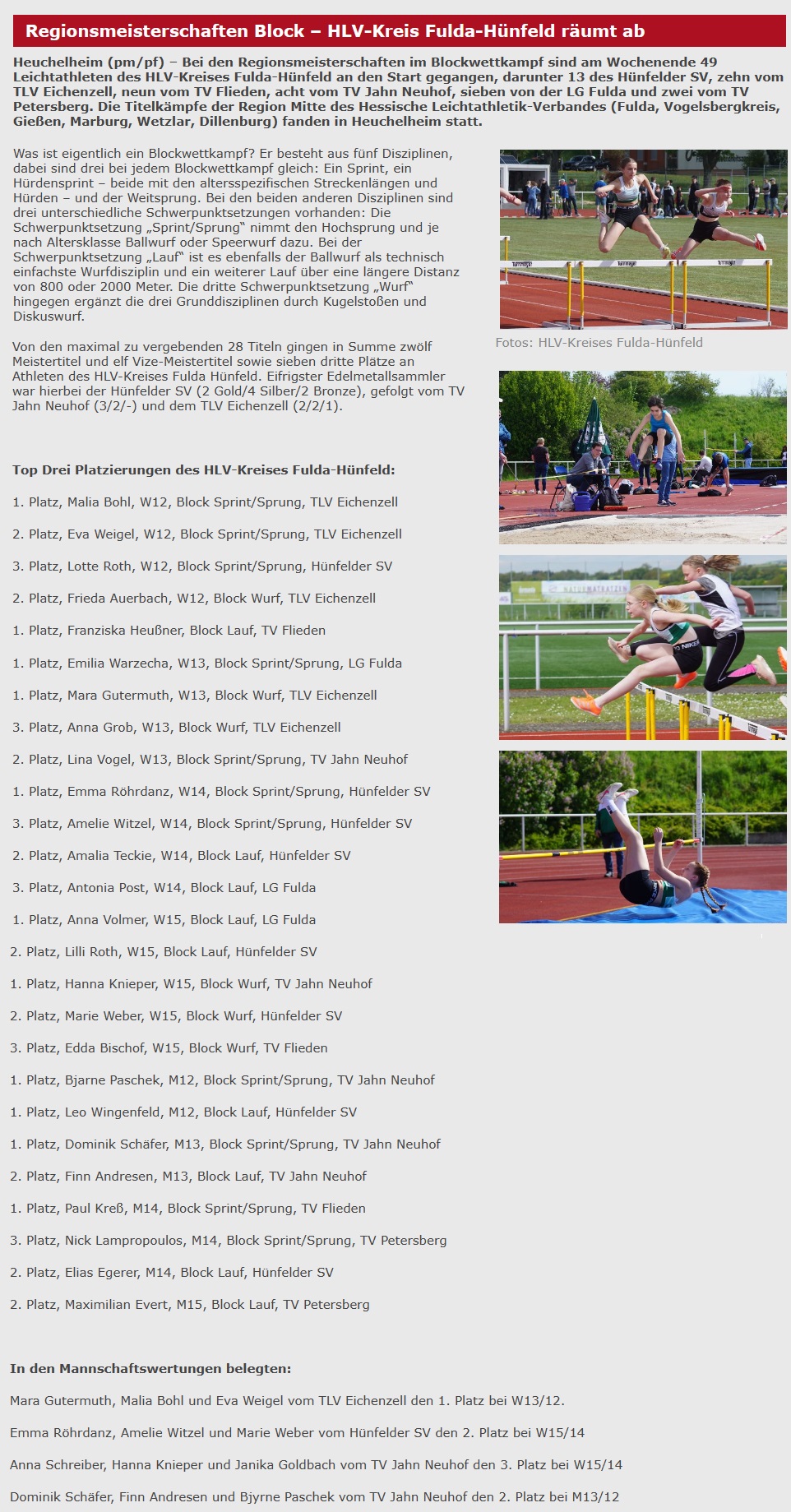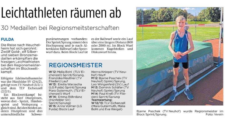 Heute sind 49 Leichtathleten des HLV-Kreises Fulda Hünfeld (Hünfelder SV (13), TLV Eichenzell (10), TV Flieden (9), TV Jahn Neuhof (8), LG Fulda (7) und TV Petersberg (2)) bei den „Regionsmeisterschaften im Blockwettkampf“ der Region Mitte des Hessische Leichtathletik-Verbandes (Fulda, Vogelsbergkreis, Gießen, Marburg, Wetzlar, Dillenburg) in Heuchelheim an den Start gegangen.