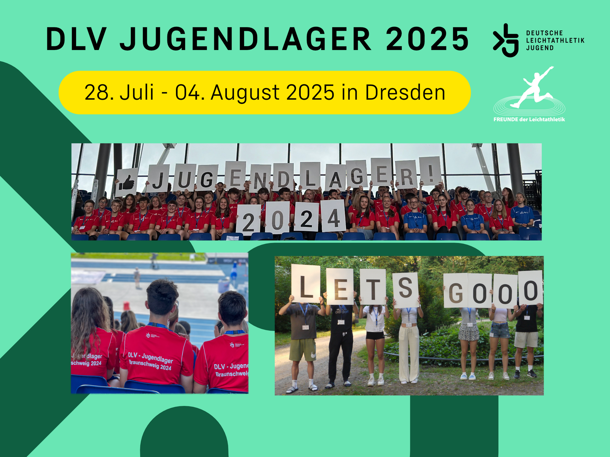 Auch in diesem Jahr findet es statt – das DLV-Jugendlager. Im Rahmen der Deutschen Leichtathletik-Meisterschaften in Dresden kommen hier jugendliche Athlet*innen aus allen Landesverbänden Deutschlands zusammen und verbringen eine sport- und erlebnisreiche Zeit! Der Hessische Leichtathletik-Verband kann vier Jugendliche entsenden und weitere Nachrücker*innen benennen, sollte ein anderer Landesverband seine Plätze nicht aufbrauchen. Dazu schreibt die HLV-Jugend diese Plätze für hessische Teilnehmer*innen der Jahrgänge 2008 bis 2010 aus und freut sich über die Bewerbungen. Das Jugendlager dient der Anerkennung sportlicher Leistung, geleisteter Jugendarbeit oder in anderer Weise herausragender Athleten. Daher wünschen wir uns viele Bewerbungen von interessierten Jugendlichen im entsprechenden Alter! Das DLV-Jugendlager findet vom 28. Juli bis 04. August in Dresden statt - alle Informationen und Kontaktmöglichkeiten befinden sich im Flyer (siehe unten).