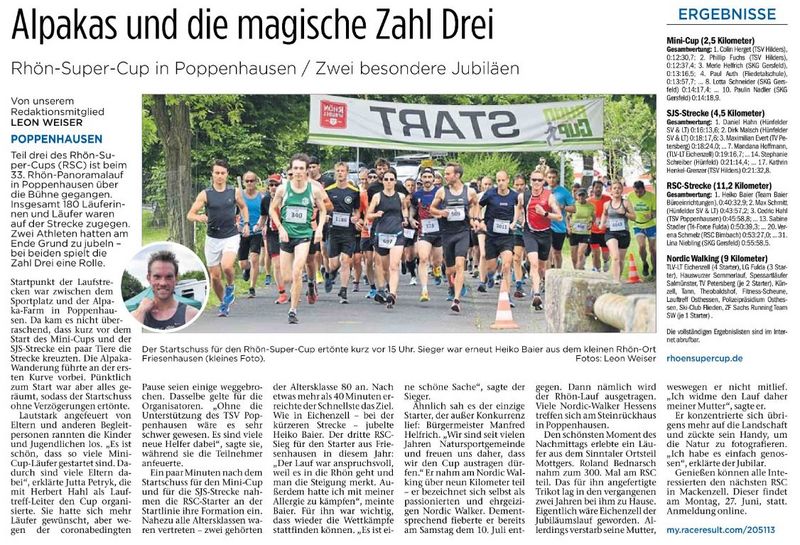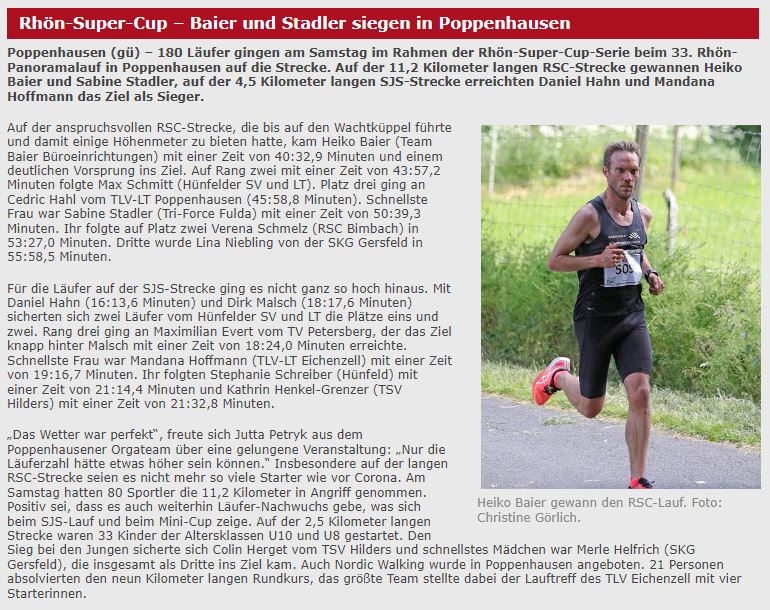 180 Läufer gingen am heutigen Samstag im Rahmen der Rhön-Super-Cup-Serie beim 33. Rhön-Panoramalauf in Poppenhausen auf die Strecke. Auf der 11,2 Kilometer langen RSC-Strecke gewannen Heiko Baier und Sabine Stadler, auf der 4,5 Kilometer langen SJS-Strecke erreichten Daniel Hahn und Mandana Hoffmann das Ziel als Sieger.
