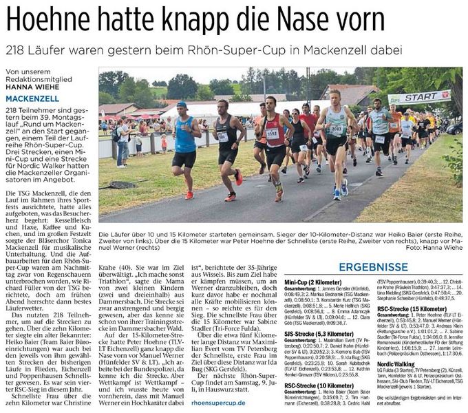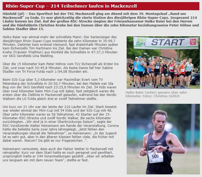 Das Sportfest bei der TSG Mackenzell ging am Abend mit dem 39. Montagslauf „Rund um Mackenzell“ zu Ende. Es war gleichzeitig die vierte Station des diesjährigen Rhön-Super-Cups. Insgesamt 214 Läufer kamen ins Ziel. Auf der großen RSC-Strecke siegten der Friesenhausener Heiko Baier bei den Herren und die Hünfelderin Christine Krahe bei den Damen über die zehn Kilometer beziehungsweise Peter Höhne und Sabine Stadler über 15.