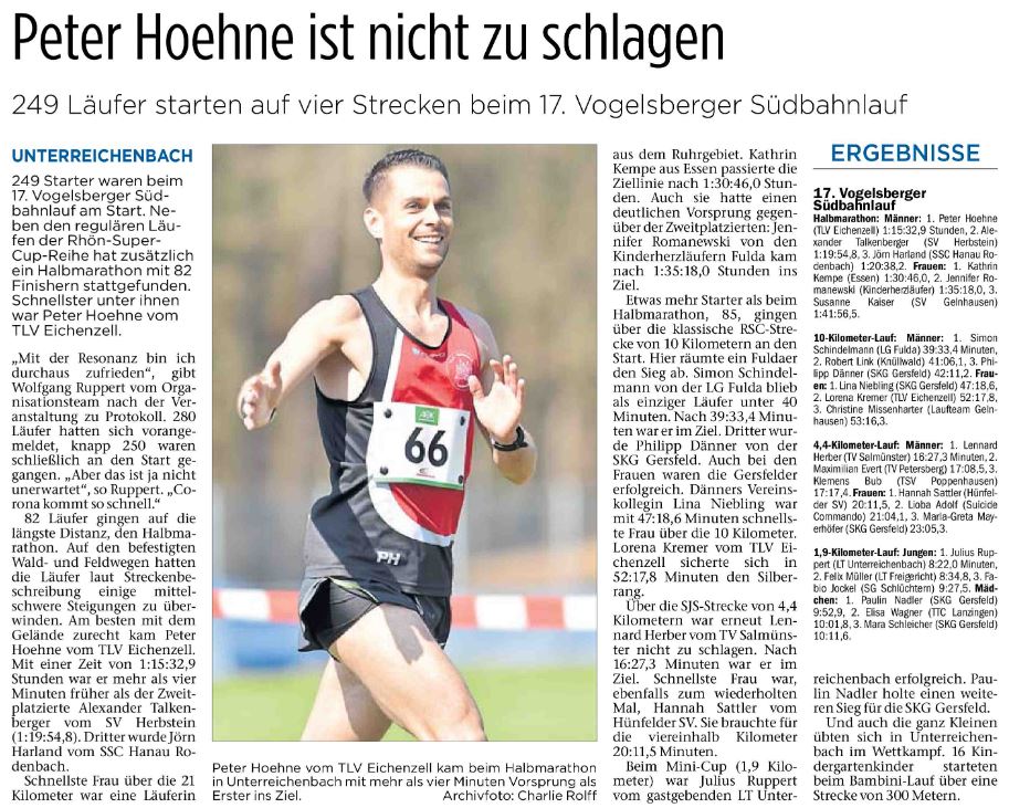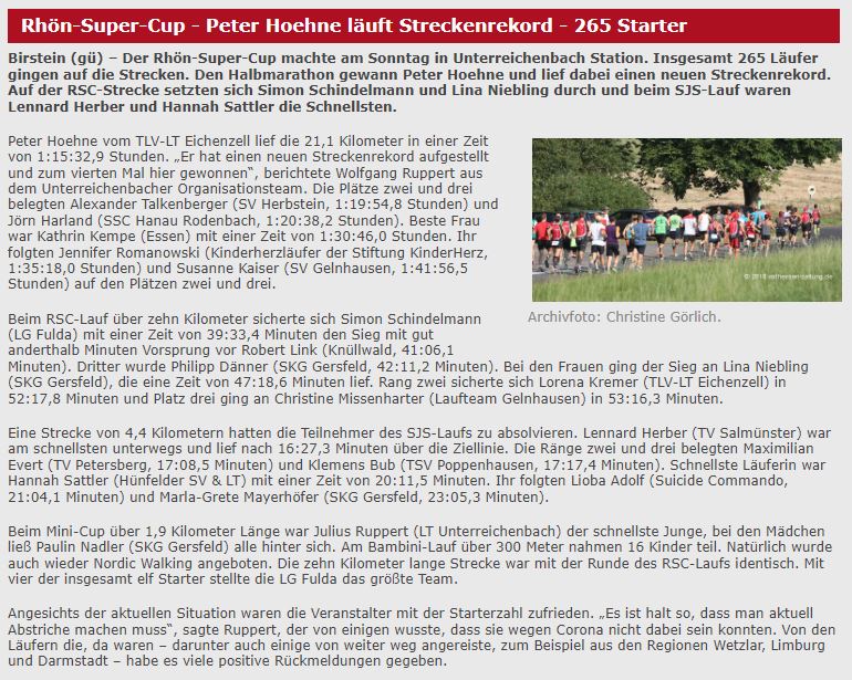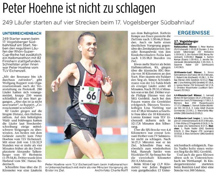 Es geht Schlag auf Schlag im Rhön-Super-Cup, heute war der Lauf in Unterreichenbach dran. Insgesamt 265 Läufer gingen auf die Strecken. Den Halbmarathon gewann Peter Hoehne und lief dabei einen neuen Streckenrekord. Auf der RSC-Strecke setzten sich Simon Schindelmann und Lina Niebling durch und beim SJS-Lauf waren Lennard Herber und Hannah Sattler die Schnellsten.