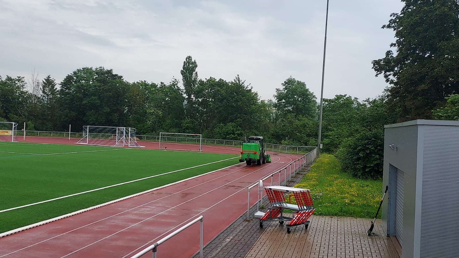In den letzten Tagen wurde die Tartanbahn auf der Rhönkampfbahn in Hünfeld einer Grundreinigung unterzogen. Eine Spezialfirma war dazu mit schwerem Gerät zwei Tag im Einsatz. Und es hat sich gelohnt; die Tartanbahn sieht wie NEU aus, erstrahlt im alten Glanze.