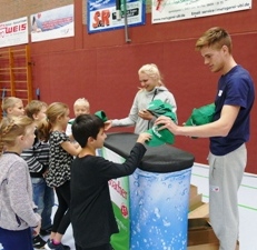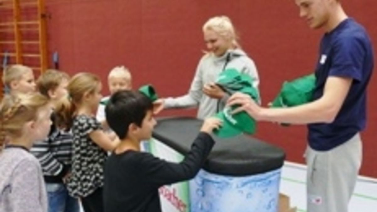 Im Anschluss durften die Schüler die zwei hessischen Nachwuchsstars interviewen und zu deren privatem und sportlichem Werdegang Fragen stellen, die von beiden geduldig und sympathisch beantwortet wurden. Als Highlight zum Schluss wurden Sporttaschen und Handtücher des Kooperationspartners Hassia verlost. Doch auch für diejenigen, die bei der Ziehung leer ausgingen, gab es eine Teilnehmerurkunde und ein Überraschungspaket von Rosbacher - bestehend aus Cap, Schlüsselanhänger und Multifunktionstuch. Die neuen Erinnerungsstü-cke ließen die Schüler dann noch ihren beiden neuen Leichtathletik-Vorbildern signieren.