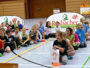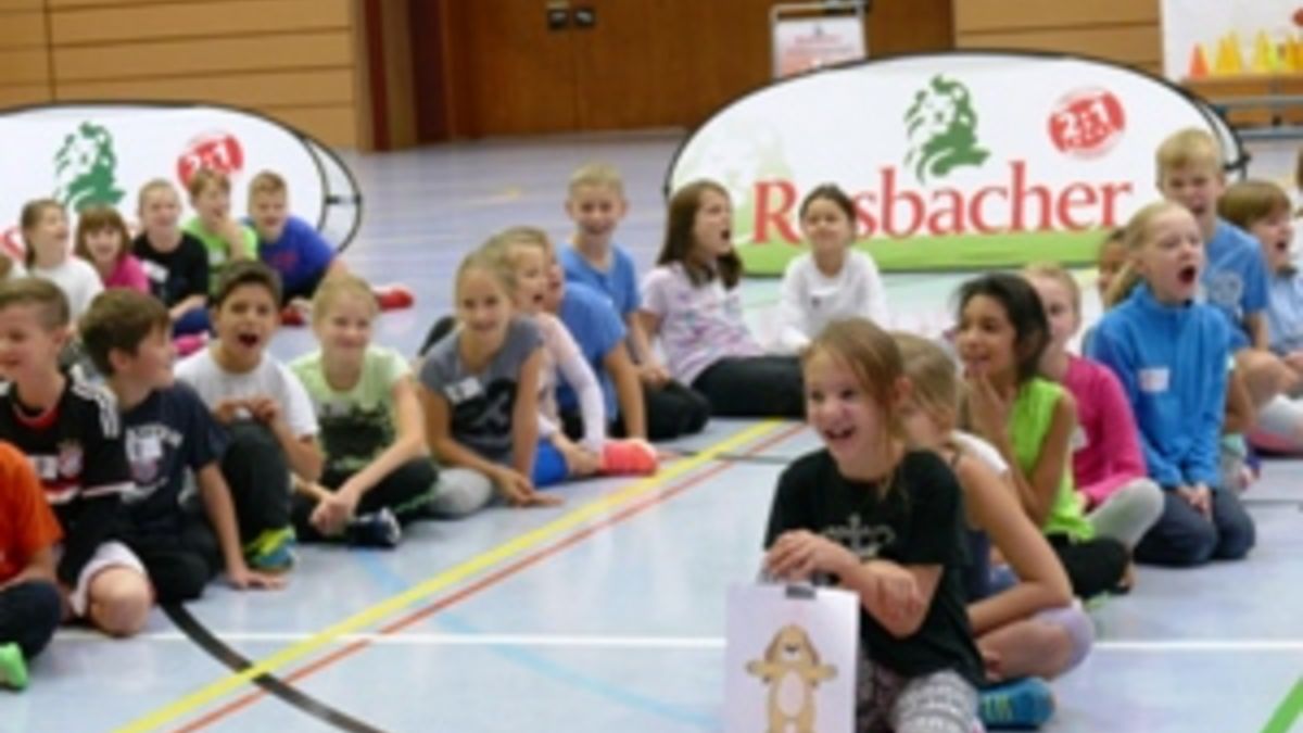 Mit einem für die Kinder nicht alltäglichen Aufwärmprogramm bereiteten dann Moderatorin Schmidt und die beiden Top-Nachwuchsleichtathleten die Kinder auf den anschließenden Leichtathletik-Stationsbetrieb vor. Insgesamt absolvierten die Grundschüler vier Stationen, bei denen sie auf unterschiedliche Art die Disziplinen Laufen, Springen und Werfen ausprobieren konnten. Dabei stand der Spaß und nicht der Leistungsgedanke im Vordergrund. An der Station „Lauf“ gaben ihnen Mayer und Reuther wertvolle Tipps mit auf den Weg. Für Abwechslung während der sportlichen Aktivitäten sorgten gesunde Getränke von Rosbacher und ein altersgerechtes Quiz. Ein kindgerechter Vortrag vom Institut für Sporternährung in Bad Nauheim zum Thema „Sport und richtiges Trinken“ rundete das Programm ab.