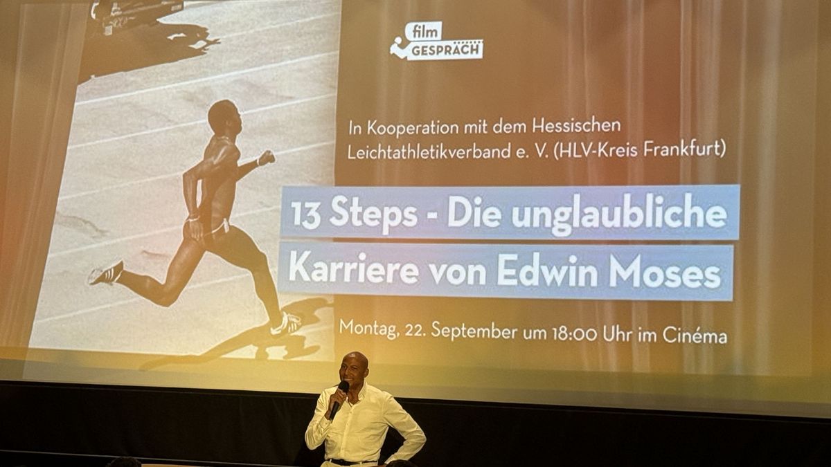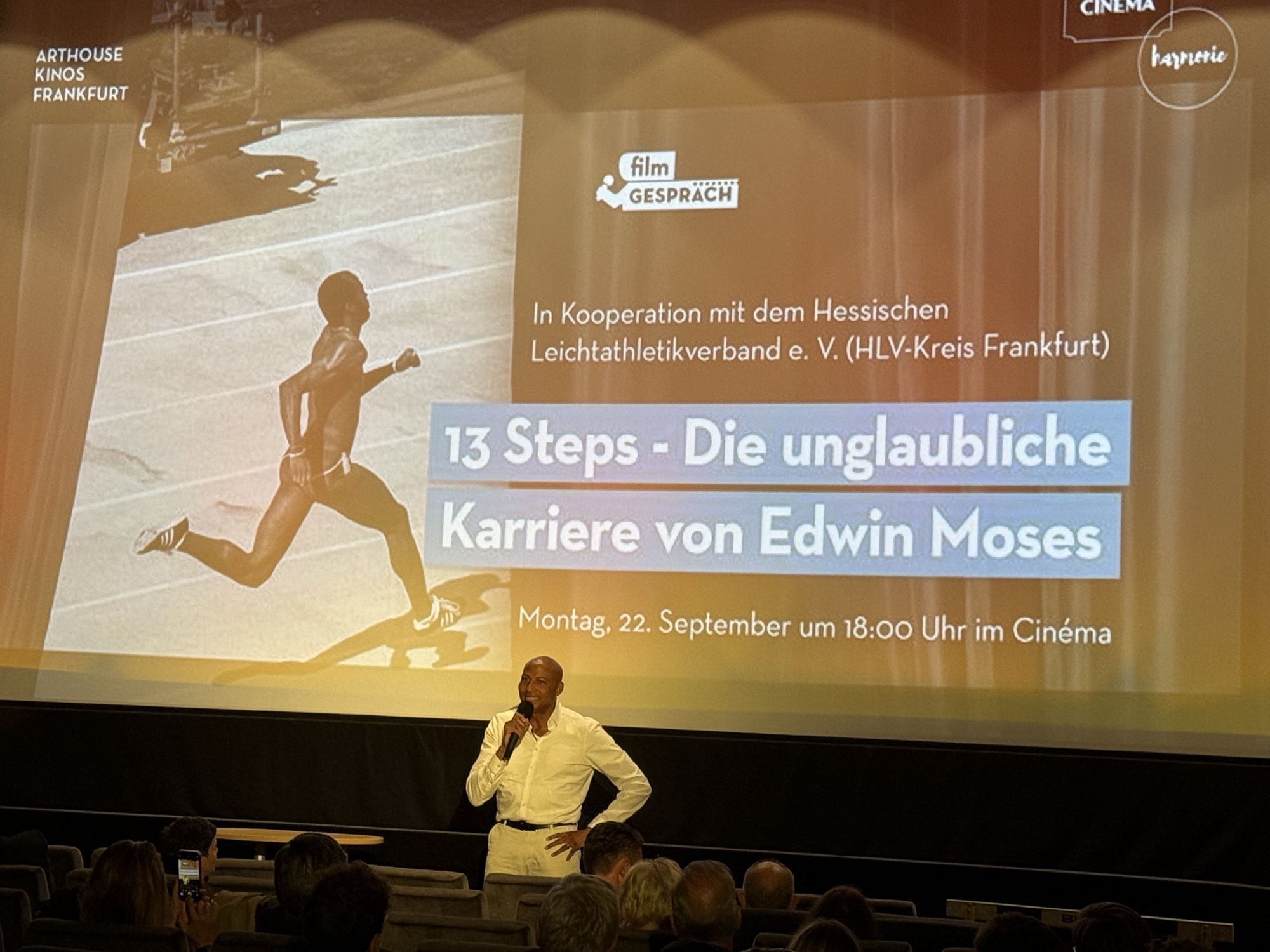Gezeigt wurde der Film „13 Steps“, eine preisgekrönte Dokumentation über das Leben auf und abseits der Rundbahn von US Langhürden Sprintstar Edwin Moses. Kurz nach der Bekanntgabe des Termins meldete das Kino bereits „Ausverkauft“ und die Frankfurter Leitathletik Gemeinde blickte voller Vorfreude auf diesen Abend.