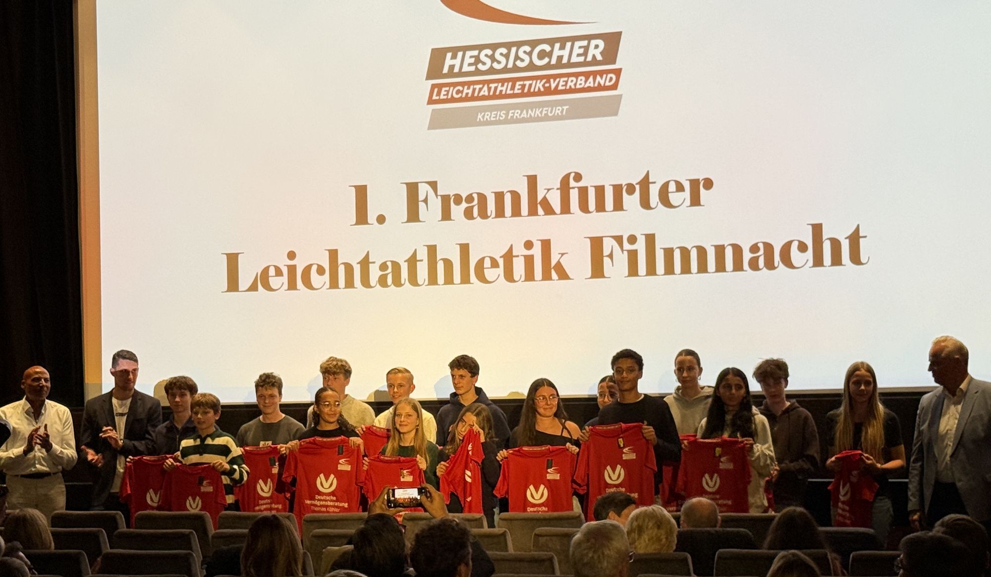 Durch das Programm führten mit viel Witz und Charme Kreisvorsitzender Andreas Bechmann (Eintracht Frankfurt), seines Zeichens Zehnkämpfer und Deutscher Meister 2025, sowie ex-400m Hürdensprinter Edgar Itt, der für die Jugendlichen extra eine Original Hürde ins Kino mitgebracht hatte und den anwesenden Frankfurter Athleten und Mitgliedern der Kreisauswahl einiges für ihr sportliches Mindset mitgeben konnte.