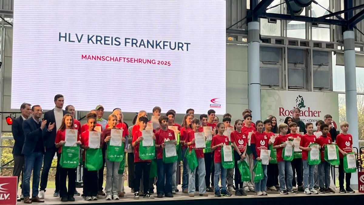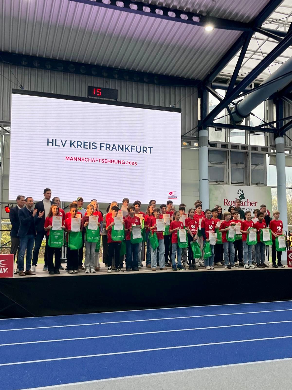 Nach dem vielumjubelten 2. Platz beim Kreisvergleich 2025 der Altersklassen U12, U14 und U16, ließ eine Einladung zu einer weiteren Ehrung neben der obligatorischen Siegerehrung nicht lange auf sich warten. Anlässlich der Bahneröffnung in der neu sanierten Leichtathletikhalle in Frankfurt-Kalbach, im Rahmen des alljährlichen HLV-Festes, ließen es sich Oberbürgermeister Mike Joseph und Kreisvorsitzender Andreas Bechmann nicht nehmen, den erfolgreichen jungen Frankfurter Leichtathleten und Leichtathletinnen samt ihrer Coaches zur Vizemeisterschaft zu gratulieren. Fast alle Kinder und Jugendlichen des Teams trainieren den Winter über in dieser Halle, die in der kalten Jahreszeit zum zweiten Wohnzimmer für die Sportler wird. Ein Ort also, der den jugendlichen Frankfurter Leichtathleten aller Vereine gleich welcher Ausrichtung zugutekommt.