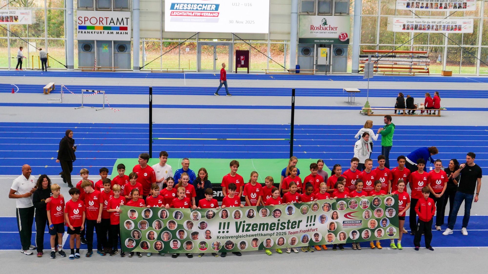 Spannend das Duell im Kugelstoßen der weiblichen U16 (W14). Hier gewann Lenya Wolf vom LA-Team Alzenau mit 10,51m knapp vor Ada Spohn (10,00m) von der TG Sachsenhausen. Mina Keil (SG Enkheim) verpasste mit 8,90m knapp das Treppchen und landete auf Platz 4. Hochklassig auch das Duell im Hochsprung der M14. Dort sicherte sich Christian Kessler von der LC Mengerskirchen mit 1,76m knapp den Sieg vor Linus Försch (1,73m) von der TG Sachsenhausen. Ein weiterer Programmpunkt neben den sportlichen Wettkämpfen, war die Ehrung der Kreisauswahl durch den Kreisvorsitzenden Andreas Bechmann. Das Team Frankfurt hatte beim Kreisvergleich 2025 erstmalig das Podium erreicht und wurde für den zweiten Platz mit einem „Vizemeister Banner“ überrascht, das zukünftig in der Leichtathletikhalle hängt, und dort den Athleten die nötige Motivation für das Jahr 2026 geben wird.