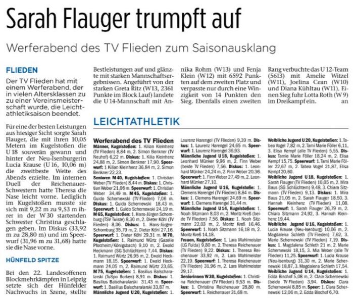 Der TV Flieden hat mit einem Werferabend, der in vielen Altersklassen zu einer Vereinsmeisterschaft wurde, die Leichtathletiksaison beendet.