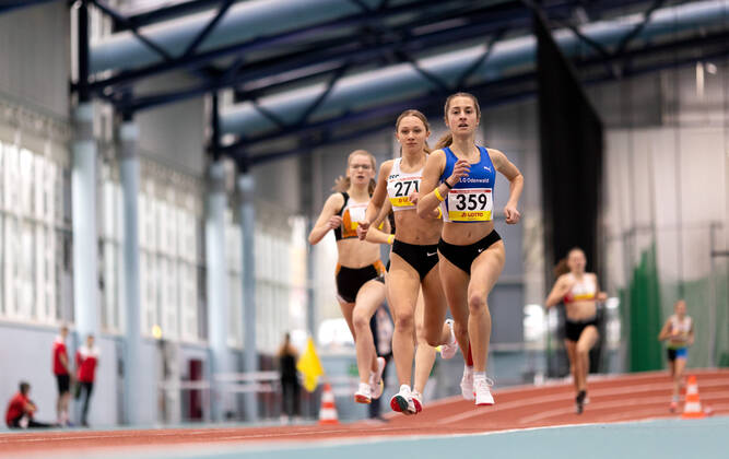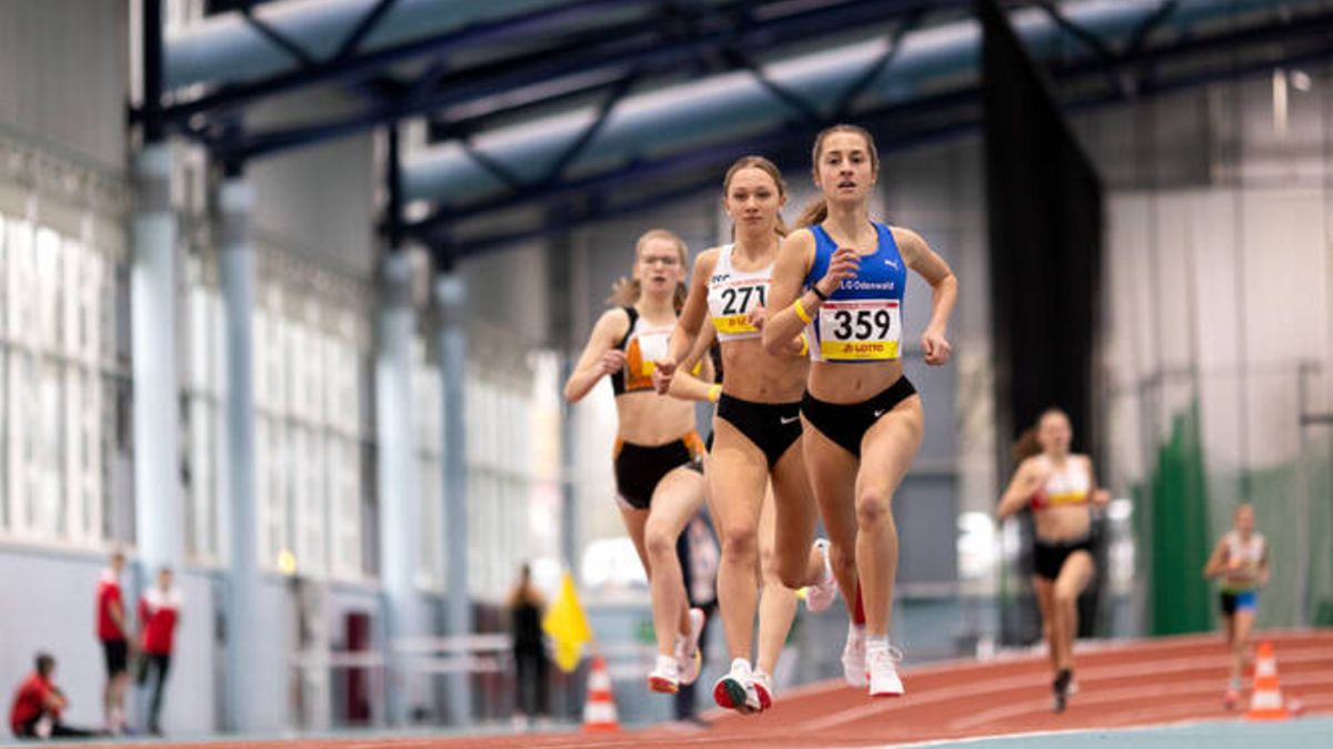 Sarah Köcher (in Führung liegend) von der LG Odenwald hat am vergangenen Wochenende bei den hessischen Hallenmeisterschaften in Frankfurt-Kalbach Gold über 800 Meter gewonnen. Nach einem packenden Finish siegte Köcher in 2:21,60 Minuten. (Foto: Raphael Schmitt)
